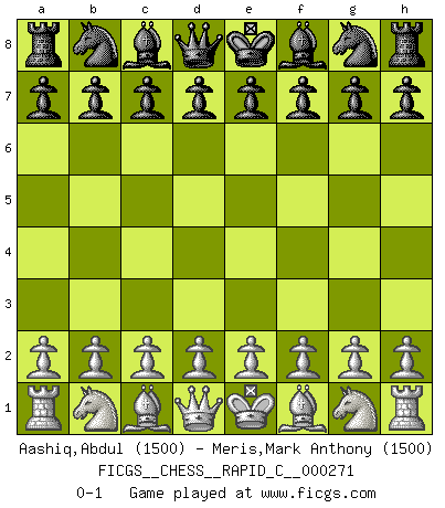 Last move : 0-1 2021 October 13 11:10:3 [Event "FICGS__CHESS__RAPID_C__000271"] [Site "FICGS"] [Date "2021.09.13"] [Round "1"] [White "Aashiq,Abdul"] [Black "Meris,Mark Anthony"] [Result "0-1"] [WhiteElo "1500"] [BlackElo "1500"] 0-1 This chess game has been lost on time (started : 2021.09.13 7:16:16) Player Black won this chess game. Follow this game move after move (download)Chess is like war on a board. (Bobby Fischer) Der Verteidiger gebe der Gewalt nach, aber nur der Gewalt. Er schaffe sich nicht freiwillig, etwa aus Blindheit oder aus Schrecken, irgendwelche Schwächen. Er lasse sich nicht bluffen. (Emanuel Lasker) Debió haber existido una vez en que los hombres eran semidióses, de otra manera no hubiesen podido inventar el Ajedrez. (Gustav Schenk) Horreur, mais aussi harmonie suprême : qu'y avait-il en effet au monde en dehors des échecs ? Le brouillard, l'inconnu, le non-être... (Vladimir Nabokov) Industry executives and analysts often mistakenly talk about strategy as if it were some kind of chess match. But in chess, you have just two opponents, each with identical resources, and with luck playing a minimal role. The real world is much more like a poker game, with multiple players trying to make the best of whatever hand fortune has dealt them. In our industry, Bill Gates owns the table until someone proves otherwise. (David Moschella, 'Computerworld')