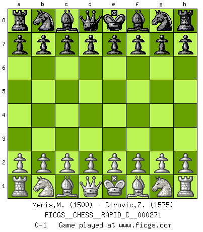 Last move : 0-1 2021 October 13 11:10:3 [Event "FICGS__CHESS__RAPID_C__000271"] [Site "FICGS"] [Date "2021.09.13"] [Round "1"] [White "Meris,Mark Anthony"] [Black "Cirovic,Zeljko"] [Result "0-1"] [WhiteElo "1500"] [BlackElo "1575"] 0-1 This chess game has been lost on time (started : 2021.09.13 7:16:16) Player Black won this chess game. Follow this game move after move (download)Chess is a terrific way for kids to build self image and self esteem. (Saudin Robovic) Mein Name ist Rustam Kamsky. Sie haben meinen Sohn belästigt. Bereiten Sie sich aufs Sterben vor. (Rustam Kamsky) Realmente no sabemos como el juego fue inventado, aunque hay sospechas. Tan pronto como descubramos a los culpables, se los haremos saber. (Bruce Pandolfini) Aux échecs, les retours au sommet sont rares : les dommages psychologiques consécutifs à une défaite sont trop sévères. (Daily Telegraph) Memory is a way of holding onto the things you love, the things you are, the things you never want to lose. (from the television show: The Wonder Years)