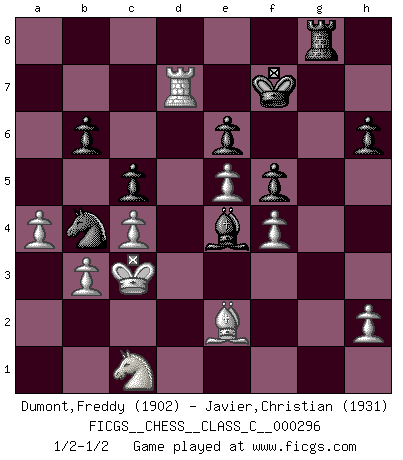 Last move : 1/2-1/2 2022 February 23 14:6:49 [Event "FICGS__CHESS__CLASS_C__000296"] [Site "FICGS"] [Date "2021.09.14"] [Round "1"] [White "Dumont,Freddy"] [Black "Javier,Christian"] [Result "1/2-1/2"] [WhiteElo "1902"] [BlackElo "1931"] 1.e4 c5 2.Nf3 Nc6 3.d4 cxd4 4.Nxd4 Nf6 5.Nc3 e6 6.Nxc6 bxc6 7.e5 Nd5 8.Ne4 Qa5+ 9.c3 Qc7 10.f4 Qb6 11.c4 Bb4+ 12.Ke2 f5 13.Nf2 Ba6 14.Kf3 Ne7 15.Be3 Bc5 16.Bxc5 Qxc5 17.Qd6 Qb6 18.b3 c5 19.Rd1 Bb7+ 20.Ke3 Kf7 21.Qxb6 axb6 22.Rxd7 Bc6 23.Rd2 Ra3 24.Nd3 Rd8 25.Rg1 Be4 26.Nc1 Rxd2 27.Kxd2 Nc6 28.g3 Nb4 29.Kc3 Ra8 30.a4 h6 31.Be2 g5 32.Rd1 gxf4 33.gxf4 Rg8 34.Rd7+ 1/2-1/2 Sicilian defense This chess game ended in a draw. Follow this game move after move (download)Fischer wanted to give the Russians a taste of their own medicine. (Larry Evans) Offener Brief an US-Präsident Bush anlässlich der Verhaftung Bobby Fishers: Verhaften Sie mich. Stecken Sie mich in dieselbe Zelle wie Bobby Fisher und geben Sie uns ein Schachspiel mit. (Boris Vassilievich Spassky) El jugador de combinación piensa hacia adelante; comienza de la posición dada y trabaja las movidas contundentes en su mente. (Emanuel Lasker) Karpov est une pièce de musée. (Garry Kasparov) Bobby never cared about money, though. His only desire was to prove that his choices were correct: He wanted chess to be important because he was a chess player, and he wanted to be important. Bobby knew money was important, but he didn't have a clue why, outside of clothes and status. The only way he could accomplish what he wanted was to fight for a lot of money. Once he got it, he gave it away. He did not know how to spend it. And once he'd become champion, after, essentially, sacrificing his life for it, he didn't know how to spend his time. (Bob Wade)