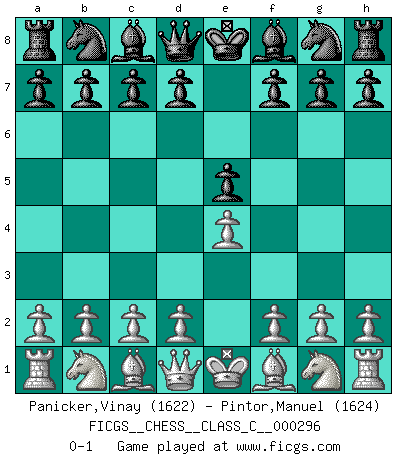 Last move : 0-1 2021 October 25 2:5:8 [Event "FICGS__CHESS__CLASS_C__000296"] [Site "FICGS"] [Date "2021.09.14"] [Round "1"] [White "Panicker,Vinay"] [Black "Pintor,Manuel"] [Result "0-1"] [WhiteElo "1622"] [BlackElo "1624"] 1.e4 e5 0-1 This chess game has been lost on time (started : 2021.09.14 15:13:34) King's pawn game Player Black won this chess game. Follow this game move after move (download)Spassky will not be psyched out by Fischer. (Mike Goodall) Korrekt heißt in Deutschland die Haltung eines Mannes, dessen Benehmen nach dem Urteile seiner Nachbarn seiner Stellung angemessen ist. Um korrekt zu sein, muß man sich der Meinung der anderen anpassen... (Emanuel Lasker) Fischer deseaba darle a los Rusos una sopa de su propia medicina. (Larry Evans) On entre au jeu d'Echecs comme on entre en Religion. Pour le joueur d'Echecs, la partie d'Echecs c'est l'office, la messe, le défilé du 1er Mai, le dépôt de gerbe au Monument aux Morts. C'est un drame sacré. (Michel Roos) Don't be irreplaceable, if you can't be replaced, you can't be promoted. (Dan Rotaru)