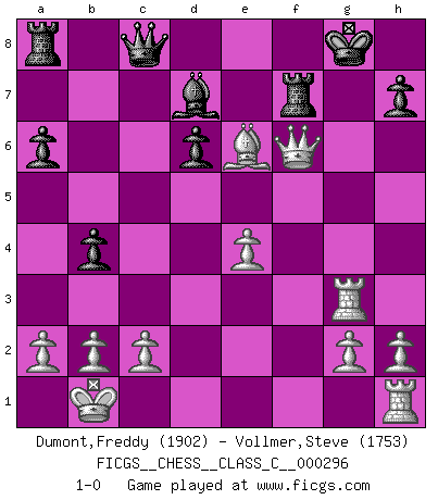 Last move : 1-0 2021 September 17 19:45:8 [Event "FICGS__CHESS__CLASS_C__000296"] [Site "FICGS"] [Date "2021.09.14"] [Round "1"] [White "Dumont,Freddy"] [Black "Vollmer,Steve"] [Result "1-0"] [WhiteElo "1902"] [BlackElo "1753"] 1.e4 c5 2.Nf3 d6 3.d4 cxd4 4.Nxd4 Nc6 5.Nc3 Nf6 6.Bg5 e6 7.Qd2 Be7 8.O-O-O a6 9.f4 Qc7 10.Bxf6 gxf6 11.Kb1 Nxd4 12.Qxd4 b5 13.f5 Bb7 14.fxe6 fxe6 15.Be2 O-O 16.Bg4 Bc8 17.Ne2 Bd7 18.Qf2 Kh8 19.Nf4 Qc8 20.Rd3 b4 21.Rh3 Rg8 22.Qh4 Rg7 23.Ng6+ Kg8 24.Nxe7+ Rxe7 25.Rg3 Rg7 26.Qxf6 Rf7 27.Bxe6 1-0 Sicilian Queenside Castling by player White (move 8) Kingside Castling by player Black (move 15) Player White won this chess game. Follow this game move after move (download)There must have been a time when men were demigods, or they could not have invented Chess. (Gustav Schenk) Sitze auf Deine Hände. (Siegbert Tarrasch) Cada Peón es una Reina en potencia. (James Mason) Comme les marins qui ont mille raisons différentes d'aller en mer, les joueurs d'échecs en ont tout autant avant de s'installer devant une table et jouer... (Vincent Bertignac, philosophe) Good decisions come from experience, and experience comes from bad decisions. (Anonymous)