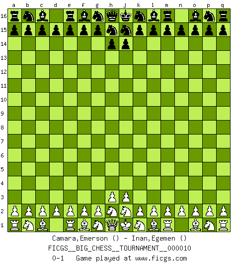 Last move : 0-1 2007 August 15 15:42:3 [Event "FICGS__BIG_CHESS__TOURNAMENT__000010"] [Site "FICGS"] [Date "2007.07.16"] [Round "1"] [White "Camara,Emerson"] [Black "Inan,Egemen"] [Result "0-1"] [WhiteElo ""] [BlackElo ""] 0-1 This big chess game has been lost on time (started : 2007.07.16 14:44:43) Follow this game move after move (download)I give 98 percent of my mental energy to Chess. Others give only 2 percent. (Bobby Fischer) Schach ist Leben. (Robert James Fischer) Aquel que teme a un Peón de Reina aislado, debería de retirarse del Ajedrez. (Siegbert Tarrasch) Les Echecs mettent en conflit, non pas deux intelligences, mais deux volontés. (Lasker) When you don't know what to do, walk fast and look worried. (Anonymous)