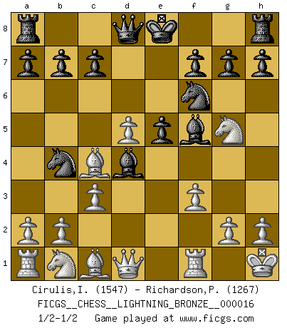 Last move : 1/2-1/2 2007 July 16 19:44:50 [Event "FICGS__CHESS__LIGHTNING_BRONZE__000016"] [Site "FICGS"] [Date "2007.07.16"] [Round "1"] [White "Cirulis,Ilmars"] [Black "Richardson,Patrick"] [Result "1/2-1/2"] [WhiteElo "1547"] [BlackElo "1267"] 1.e4 e5 2.Nf3 Nc6 3.Bc4 Nf6 4.Ng5 d5 5.exd5 Nb4 6.O-O Bg4 7.f3 Bc5+ 8.d4 Bxd4+ 9.Kh1 Bf5 10.c3 1/2-1/2 Two knights defense Kingside Castling by player White (move 6) This chess game ended in a draw. Follow this game move after move (download)Not only will I predict his triumph over Botvinnik, but I'll go further and say that he'll probably be the greatest Chess player that ever lived. (John Collins) Spiel ein langweiliges Spiel zu Ende und lustige Dinge können passieren. (Hans Ree) El Ajedrez tiene tanto misterio como las mujeres. (Purdy) Echiquier : carré parfait, comme la Jérusalem nouvelle décrite par l'auteur de l'Apocalypse, huit cases sur huit, exaltation du chiffre 4, symbole du cosmos aux quatre horizons... où le noir et le blanc, l'ombre et la lumière, le mal et le bien s'entremêlent et se conjuguent. (Robert Couffignal, Le Gambit du poète) Inventor: A person who makes an ingenious arrangement of wheels, levers and springs, and believes it civilization. (Ambrose Bierce, The Devil's Dictionary)
