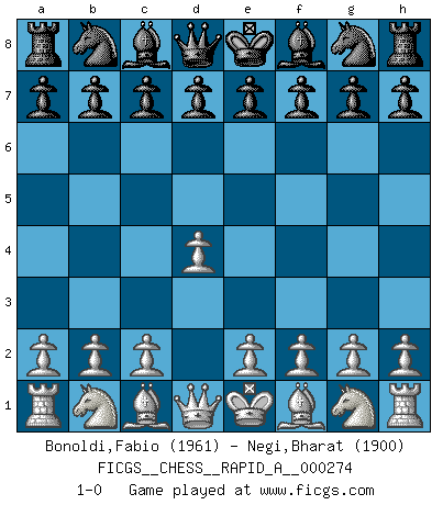 Last move : 1-0 2021 October 17 0:18:20 [Event "FICGS__CHESS__RAPID_A__000274"] [Site "FICGS"] [Date "2021.09.16"] [Round "1"] [White "Bonoldi,Fabio"] [Black "Negi,Bharat"] [Result "1-0"] [WhiteElo "1961"] [BlackElo "1900"] 1.d4 1-0 This chess game has been lost on time (started : 2021.09.16 15:56:33) Queen's pawn Player White won this chess game. Follow this game move after move (download)I guess a certain amount of temperament is expected of Chess geniuses. (Ron Gross) Im Reiche der Wirklichkeit ist man nie so glücklich wie im Reiche der Gedanken. (Arthur Schopenhauer) Hoy en día, si tu no eres un Gran Maestro a los 14 años, es mejor que lo olvides. (Anand Viswanathan) On croit qu'il y a plus de mauvais joueurs que de bons joueurs, c'est faux : Il y a autant de joueurs qui gagnent que de joueurs qui perdent. (Philippe Geluck) Either move or be moved. (Ezra Pound)