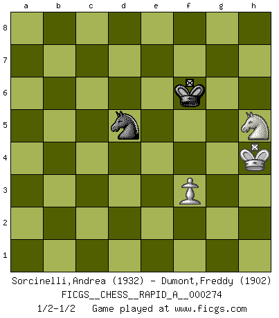 Last move : 1/2-1/2 2021 December 10 19:1:32 [Event "FICGS__CHESS__RAPID_A__000274"] [Site "FICGS"] [Date "2021.09.16"] [Round "1"] [White "Sorcinelli,Andrea"] [Black "Dumont,Freddy"] [Result "1/2-1/2"] [WhiteElo "1932"] [BlackElo "1902"] 1.e4 c5 2.Nf3 d6 3.c3 Nf6 4.h3 Nc6 5.Bd3 e6 6.O-O Be7 7.Bc2 Bd7 8.Re1 Rc8 9.d3 O-O 10.Be3 Qc7 11.Nbd2 Rfd8 12.Rc1 h6 13.a3 Qb8 14.d4 cxd4 15.cxd4 b5 16.Nf1 b4 17.a4 Bf8 18.Ng3 Na5 19.b3 Rc7 20.d5 exd5 21.exd5 Rdc8 22.Ne4 Nxe4 23.Bxe4 Rxc1 24.Bxc1 Rxc1 25.Qxc1 Nxb3 26.Qc4 Nc5 27.Bc2 a5 28.Nd4 Qb7 29.h4 h5 30.Re3 g6 31.Nc6 Qc7 32.g4 Bxg4 33.Qf4 f5 34.f3 Bh3 35.Qg3 Qf7 36.Qxh3 b3 37.Bxb3 Nxb3 38.Qg2 Nc5 39.Nd8 Qf6 40.Qg5 Bg7 41.Ne6 Qxg5+ 42.hxg5 Bb2 43.Kg2 Nxa4 44.Rb3 Kf7 45.Rb7+ Ke8 46.Rb8+ Ke7 47.Rb5 Bc3 48.Nf4 Bd2 49.Nxg6+ Kf7 50.Nh4 Bxg5 51.Nxf5 Bf4 52.Rxa5 Nc3 53.Ra6 Nxd5 54.Nxd6+ Ke6 55.Ne4 Ke5 56.Ng3 h4 57.Nh5 Bg5 58.Kh3 Be7 59.Ra4 Nc3 60.Rc4 Nd5 61.Re4+ Kf5 62.Ng7+ Kf6 63.Rxe7 Kxe7 64.Kxh4 Kf6 65.Nh5+ 1/2-1/2 Sicilian Kingside Castling by player White (move 6) Kingside Castling by player Black (move 9) 10 pieces endgame at move 52 : White KRNPP , Black KBNPP WHITE : King + 1 Rook 1 Knight 2 Pawns BLACK : King + 1 Bishop 1 Knight 2 Pawns 9 pieces endgame at move 53 : White KRNP , Black KBNPP WHITE : King + 1 Rook 1 Knight 1 Pawn BLACK : King + 1 Bishop 1 Knight 2 Pawns 8 pieces endgame at move 54 : White KRNP , Black KBNP WHITE : King + 1 Rook 1 Knight 1 Pawn BLACK : King + 1 Bishop 1 Knight 1 Pawn 7 pieces endgame at move 63 : White KRNP , Black KNP WHITE : King + 1 Rook 1 Knight 1 Pawn BLACK : King + 1 Knight 1 Pawn 6 pieces endgame at move 63 : White KNP , Black KNP WHITE : King + 1 Knight 1 Pawn BLACK : King + 1 Knight 1 Pawn 5 pieces endgame at move 64 : White KNP , Black KN WHITE : King + 1 Knight 1 Pawn BLACK : King + 1 Knight This chess game ended in a draw. Follow this game move after move (download)Pawns are born free, yet they are everywhere in chains. (Rick Kennedy) Vom Schach wurde gesagt das Leben sei dafür nicht lange genug. Aber das ist der Fehler des Lebens, nicht des Schach'. (Irving Chernev) Aquellos que dicen que entienden al Ajedrez, no entienden nada. (Robert Hubner) La menace est plus forte que l'exécution. (Aaron Nimzovitch) Don't anthropomorphize computers - they hate it. (Anonymous)