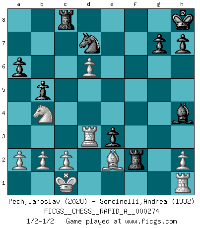 Last move : 1/2-1/2 2021 November 11 2:44:11 [Event "FICGS__CHESS__RAPID_A__000274"] [Site "FICGS"] [Date "2021.09.16"] [Round "1"] [White "Pech,Jaroslav"] [Black "Sorcinelli,Andrea"] [Result "1/2-1/2"] [WhiteElo "2028"] [BlackElo "1932"] 1.e4 c5 2.Nf3 d6 3.d4 cxd4 4.Nxd4 Nf6 5.Nc3 a6 6.Be3 e5 7.Nb3 Be7 8.f3 Be6 9.Qd2 O-O 10.O-O-O Nbd7 11.g4 b5 12.g5 Nh5 13.Nd5 Bxd5 14.exd5 f6 15.gxf6 Bxf6 16.Na5 Nf4 17.Nc6 Qe8 18.Qb4 Qh5 19.Bxf4 exf4 20.Qxd6 Qxf3 21.Qe6+ Kh8 22.Be2 Qe3+ 23.Qxe3 fxe3 24.d6 Rac8 25.Nb4 Bh4 26.Rd3 Rf2 1/2-1/2 Sicilian : Najdorf, Byrne (English) attack Kingside Castling by player Black (move 9) Queenside Castling by player White (move 10) This chess game ended in a draw. Follow this game move after move (download)Man is a frivolous, a specious creature, and like a Chess player, cares more for the process of attaining his goal than for the goal itself. (Dostoyevsky) Es macht mich traurig, wenn ich sehe, dass Golfprofis mehr verdienen als Schachsportler. Obwohl ich davon überzeugt bin, dass wir Schachspieler viel härter trainieren müssen als die Golfer. (Alexandra Kosteniuk) Coloca el contenido del tablero de Ajedrez en un sombrero, agita las piezas vigorosamente, derrámalas en el tablero desde una altura de medio metro y así obtienes el estilo de Wilhelm Steinitz. (H. E. Bird) On a dit que l'homme se distingue de l'animal par le fait qu'il achète plus de livres qu'il ne peut en lire. Je voudrais suggérer qu'inclure à la liste des livres quelques livres d'échecs rendrait la distinction manifeste. (Edward Lasker) I would love to change the world, but they won't give me the source code. (Unknown)