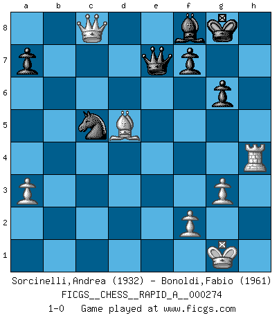 Last move : 1-0 2021 November 28 19:35:21 [Event "FICGS__CHESS__RAPID_A__000274"] [Site "FICGS"] [Date "2021.09.16"] [Round "1"] [White "Sorcinelli,Andrea"] [Black "Bonoldi,Fabio"] [Result "1-0"] [WhiteElo "1932"] [BlackElo "1961"] 1.e4 d5 2.exd5 Qxd5 3.Nc3 Qd8 4.d4 Nf6 5.Nf3 Bg4 6.h3 Bxf3 7.Qxf3 c6 8.Be3 e6 9.Bd3 Nbd7 10.O-O Be7 11.Rad1 O-O 12.a3 Nb6 13.Bc1 Nbd5 14.Na2 b5 15.b3 Rc8 16.c4 Nb6 17.Nc3 bxc4 18.bxc4 Rc7 19.Ne2 Qa8 20.Bf4 Rd7 21.Be5 Rfd8 22.Nf4 c5 23.d5 exd5 24.cxd5 c4 25.Bf5 Rd6 26.Bxd6 Bxd6 27.Bc2 Qc8 28.Rfe1 Qc7 29.g3 Nbd7 30.Nh5 Nxh5 31.Qxh5 g6 32.Qg5 Kg7 33.Qd2 Kg8 34.Qc3 Be5 35.d6 Bxd6 36.Kg2 Nf8 37.h4 Ne6 38.h5 Bf8 39.Rxd8 Nxd8 40.Re4 Qb7 41.Kg1 Ne6 42.hxg6 hxg6 43.Rh4 Bg7 44.Qxc4 Qe7 45.Qc8+ Bf8 46.Bb3 Nc5 47.Bd5 1-0 Scandinavian (centre counter) defense Kingside Castling by player White (move 10) Kingside Castling by player Black (move 11) Player White won this chess game. Follow this game move after move (download)Chess is played with the mind and not with the hands ! (Renaud and Kahn) Du kannst im Schach nur gut werden, wenn du das Spiel liebst. (Robert James Fischer) El ganar no lo es todo... pero el perder es nada. (Mednis) Il n'y a pas eu de défaite parce que je ne crois pas que cet ordinateur ait jamais existé. IBM a triché en refusant d'imprimer les modes de recherche de la machine. C'est évident, pendant le match, des coups décisifs ont été joués par des êtres humains. Aujourd'hui, les meilleurs spécialistes en informatique ne peuvent toujours pas expliquer comment Deep-Blue a pu jouer contre la logique des ordinateurs. IBM a gagné une guerre de communication, mais ils sont incapables de prouver que l'ordinateur a gagné tout seul. (Garry Kasparov) Fame, I have already. Now I need the money. (an elderly Steinitz)