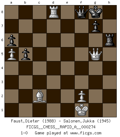 Last move : 1-0 2022 January 3 6:52:46 [Event "FICGS__CHESS__RAPID_A__000274"] [Site "FICGS"] [Date "2021.09.16"] [Round "1"] [White "Faust,Dieter"] [Black "Salonen,Jukka"] [Result "1-0"] [WhiteElo "1988"] [BlackElo "1945"] 1.e4 e5 2.Nf3 Nc6 3.Bb5 a6 4.Ba4 Nf6 5.O-O Be7 6.Re1 b5 7.Bb3 d6 8.c3 O-O 9.h3 Na5 10.Bc2 c5 11.d4 cxd4 12.cxd4 Bb7 13.d5 Rc8 14.b3 Qc7 15.Bd3 Nxe4 16.Bxe4 f5 17.Bd3 e4 18.Bg5 Bd8 19.b4 exf3 20.Bxd8 Qxd8 21.bxa5 fxg2 22.Nd2 Rc3 23.Nb3 Bxd5 24.Qd2 Qf6 25.Rac1 Rxc1 26.Rxc1 Qh4 27.Be2 Bxb3 28.axb3 Qxh3 29.Qd5+ Kh8 30.Qxg2 Qxb3 31.Qb7 Qe6 32.Bf3 f4 33.Rd1 Qg6+ 34.Kf1 Qe6 35.Qc6 Qh3+ 36.Kg1 d5 37.Qd6 Rg8 38.Qxf4 Re8 39.Bxd5 Qh5 40.Bf3 Qg6+ 41.Kf1 h6 42.Rd6 Re6 43.Rd8+ Kh7 44.Bd1 Rc6 45.Qe5 Qb1 46.Qe8 Rf6 47.Qg8+ Kg6 48.Rd4 h5 49.Qe8+ Kh7 50.Qxh5+ Rh6 51.Qd5 Kh8 52.Rd3 Qb4 53.Bb3 Qf8 54.Qg5 Kh7 55.Bc2 Kg8 56.Rd8 1-0 Ruy Lopez : Closed Kingside Castling by player White (move 5) Kingside Castling by player Black (move 8) Player White won this chess game. Follow this game move after move (download)Castle early and often. (Rob Sillars) Frage: Gibt es etwas was Sie mehr lieben als Autobahnen ohne Tempobegrenzungen? - Antwort: Deutsche Frauen ohne Tempobegrenzungen. (Loek van Wely) Los problemas de Ajedrez exigen del compositor las mismas virtudes que caracterizan todo el arte de valor: originalidad, invención, concisión, armonía, complejidad e insinceridad explendida. (Vladimir Nabokov) Les Echecs sont et restent toujours un combat, un combat intégral comme la boxe, la lutte ou un autre sport, et où il doit y avoir un vainqueur et un vaincu. (Joseph Emil Diemer) 'preceded by its own quotation yields a falsehood' preceded by its own quotation yields a falsehood. (W. V. O. Quine - Set Theory And Its Logic, 1953)