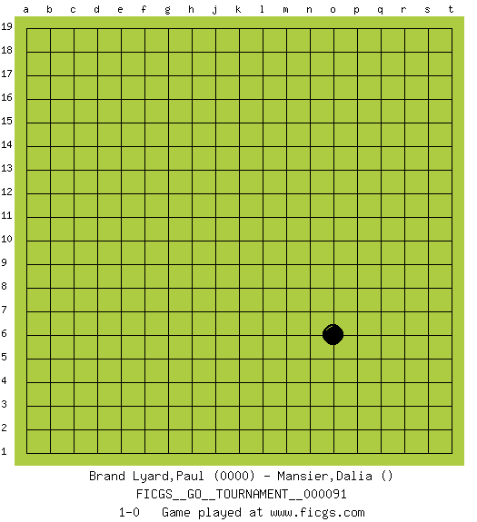 Last move : 1-0 2021 October 17 0:18:20 [Event "FICGS__GO__TOURNAMENT__000091"] [Site "FICGS"] [Date "2021.09.16"] [Round "1"] [Black "Brand Lyard,Paul"] [White "Mansier,Dalia"] [Result "1-0"] [Rating 1 "0000"] 1.o6 1-0 This go game has been lost on time (started : 2021.09.16 16:3:13) Here are the names of the openings (joseki) played in the four corners : Corner q4 : o6 1-0 This joseki is unknown. A weak or weird move has probably been played in this corner. Player Black won this Go (weiqi, baduk) game. Follow this game move after move (download)Five liberties for tactical stability. (Anonymous) Knowledge rests not upon truth alone, but upon error also. (Carl G. Jung)