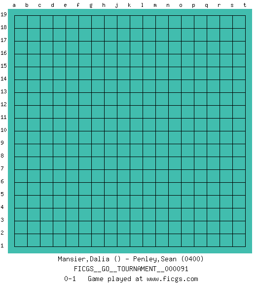 Last move : 0-1 2021 October 17 0:18:20 [Event "FICGS__GO__TOURNAMENT__000091"] [Site "FICGS"] [Date "2021.09.16"] [Round "1"] [Black "Mansier,Dalia"] [White "Penley,Sean"] [Result "0-1"] [Rating 2 "0400"] 0-1 This go game has been lost on time (started : 2021.09.16 16:3:13) Here are the names of the openings (joseki) played in the four corners : Player White won this Go (weiqi, baduk) game. Follow this game move after move (download)Take the cutting stone on the second line. (Anonymous) Man is reluctant to give credit for intelligence to anyone, except his enemies. (Albert Einstein)
