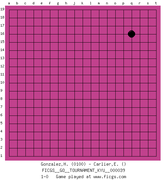 Last move : 1-0 2007 August 19 22:24:7 [Event "FICGS__GO__TOURNAMENT_KYU__000039"] [Site "FICGS"] [Date "2007.07.20"] [Round "1"] [Black "Gonzalez,Hector"] [White "Carlier,Emmanuel"] [Result "1-0"] [Rating 1 "0100"] 1.q16 1-0 This go game has been lost on time (started : 2007.07.20 6:17:41) Here are the names of the openings (joseki) played in the four corners : Player Black won this Go (weiqi, baduk) game. Follow this game move after move (download)Do not make moves that strengthen your opponent ! (Anonymous) Train yourself to let go of everything you fear to lose. (Master Yoda in Star Wars ep.3)