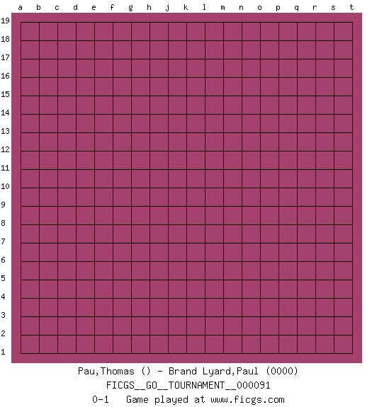 Last move : 0-1 2021 October 17 0:18:20 [Event "FICGS__GO__TOURNAMENT__000091"] [Site "FICGS"] [Date "2021.09.16"] [Round "1"] [Black "Pau,Thomas"] [White "Brand Lyard,Paul"] [Result "0-1"] [Rating 2 "0000"] 0-1 This go game has been lost on time (started : 2021.09.16 16:3:13) Here are the names of the openings (joseki) played in the four corners : Player White won this Go (weiqi, baduk) game. Follow this game move after move (download)Win the early ko to win the game. (Anonymous) Empty your mind, be formless, shapeless — like water. (Bruce Lee)