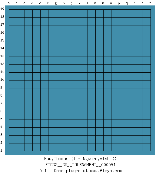 Last move : 0-1 2021 October 17 0:18:20 [Event "FICGS__GO__TOURNAMENT__000091"] [Site "FICGS"] [Date "2021.09.16"] [Round "1"] [Black "Pau,Thomas"] [White "Nguyen,Vinh"] [Result "0-1"] 0-1 This go game has been lost on time (started : 2021.09.16 16:3:13) Here are the names of the openings (joseki) played in the four corners : Player White won this Go (weiqi, baduk) game. Follow this game move after move (download)Each step in a ladder is worth 7 points. (Anonymous) In theory there is no difference between theory and practice. In practice there is. (Yogi Berra)