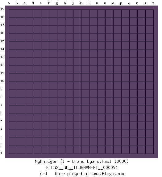 Last move : 0-1 2021 October 17 0:18:20 [Event "FICGS__GO__TOURNAMENT__000091"] [Site "FICGS"] [Date "2021.09.16"] [Round "1"] [Black "Mykh,Egor"] [White "Brand Lyard,Paul"] [Result "0-1"] [Rating 2 "0000"] 0-1 This go game has been lost on time (started : 2021.09.16 16:3:13) Here are the names of the openings (joseki) played in the four corners : Player White won this Go (weiqi, baduk) game. Follow this game move after move (download)To invade, need 20 points in open area; otherwise, keshi is best. (Yang Yilun, 7p) All maxims have their antagonist maxims; proverbs should be sold in pairs, a single one being but a half truth. (William Mathews)