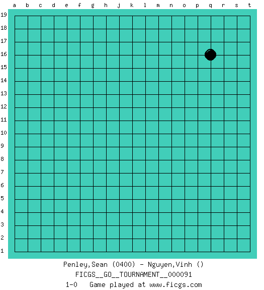 Last move : 1-0 2021 October 19 8:19:53 [Event "FICGS__GO__TOURNAMENT__000091"] [Site "FICGS"] [Date "2021.09.16"] [Round "1"] [Black "Penley,Sean"] [White "Nguyen,Vinh"] [Result "1-0"] [Rating 1 "0400"] 1.q16 1-0 This go game has been lost on time (started : 2021.09.16 16:3:13) Here are the names of the openings (joseki) played in the four corners : Player Black won this Go (weiqi, baduk) game. Follow this game move after move (download)Conservative and slow will win. Believe it ! (Anonymous) Life is pain my dear and anyone who says otherwise is selling something. (Princess Bride)