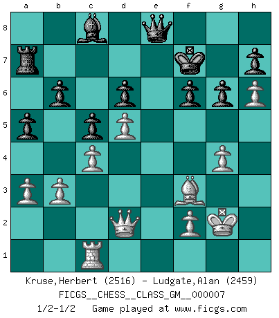 Last move : 1/2-1/2 2021 October 9 15:38:39 [Event "FICGS__CHESS__CLASS_GM__000007"] [Site "FICGS"] [Date "2021.09.18"] [Round "1"] [White "Kruse,Herbert"] [Black "Ludgate,Alan"] [Result "1/2-1/2"] [WhiteElo "2516"] [BlackElo "2459"] 1.d4 Nf6 2.c4 g6 3.Nc3 Bg7 4.e4 d6 5.Be2 O-O 6.h4 c5 7.d5 e6 8.h5 exd5 9.exd5 Re8 10.h6 Bh8 11.Bg5 Qb6 12.b3 Ne4 13.Nxe4 Rxe4 14.Kf1 Nd7 15.Nf3 Re8 16.Rc1 Ne5 17.g3 Nxf3 18.Bxf3 Bd4 19.Kg2 f6 20.Bf4 a5 21.Qd2 Qb4 22.Qd1 Qb6 23.Re1 Rxe1 24.Qxe1 Kf7 25.a3 Qd8 26.Qd2 b6 27.Be3 Bxe3 28.Qxe3 Qe8 29.Qd2 Ra7 30.g4 1/2-1/2 King's Indian : 5.Be2 Kingside Castling by player Black (move 5) This chess game ended in a draw. Follow this game move after move (download)Without error there can be no brilliancy. (Emanuel Lasker) Ohne Fehler kann es keine Brillanz geben. (Emanuel Lasker) Aunque la mayoría de la gente disfruta observar las partidas de los grandes Maestros de ataque, algunos de los jugadores mas notables en la historia han sido los jugadores silenciosos posicionales. Lentamente ellos te aplastan despojandote de tu espacio, congestionando tus piezas y dejandote virtualmente sin nada que hacer. (Yasser Seirawan) Mais l'homme est une créature légère et illogique : semblable au joueur d'échecs, il n'aime que le processus du but à atteindre, non le but lui-même. (Dostoïevsky) The ego is not master in its own house. (Sigmund Freud)