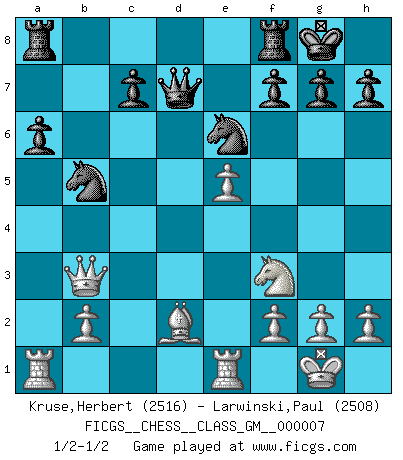 Last move : 1/2-1/2 2021 October 4 0:0:59 [Event "FICGS__CHESS__CLASS_GM__000007"] [Site "FICGS"] [Date "2021.09.18"] [Round "1"] [White "Kruse,Herbert"] [Black "Larwinski,Paul"] [Result "1/2-1/2"] [WhiteElo "2516"] [BlackElo "2508"] 1.e4 e5 2.Nf3 Nc6 3.Bb5 a6 4.Ba4 Nf6 5.O-O Nxe4 6.d4 b5 7.Bb3 d5 8.dxe5 Be6 9.Nbd2 Nc5 10.c3 d4 11.Bxe6 Nxe6 12.cxd4 Ncxd4 13.a4 Bb4 14.axb5 Nxb5 15.Qb3 Bxd2 16.Bxd2 O-O 17.Rfe1 Qd7 1/2-1/2 Ruy Lopez : Open, 7.Bb3 Kingside Castling by player White (move 5) Kingside Castling by player Black (move 16) This chess game ended in a draw. Follow this game move after move (download)What is the object of playing a gambit opening?... To acquire a reputation of being a dashing player at the cost of losing a game. (Siegbert Tarrasch) Ich kenne keine einzige Person, die behaupten würde, Garri Kasparow sei ein guter Mensch (Nigel Short) Los errores estan ahí, esperando a que se cometan. (Savielly Tartakower) Le jeu d'échecs est comme rejeté hors du temps. (Antoine de Saint-Exupéry) Experiences are the keys to life. (Daniel Parmet)