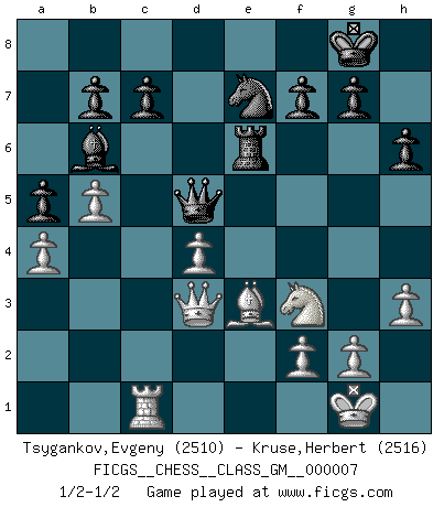 Last move : 1/2-1/2 2022 January 13 9:41:43 [Event "FICGS__CHESS__CLASS_GM__000007"] [Site "FICGS"] [Date "2021.09.18"] [Round "1"] [White "Tsygankov,Evgeny"] [Black "Kruse,Herbert"] [Result "1/2-1/2"] [WhiteElo "2510"] [BlackElo "2516"] 1.e4 e5 2.Nf3 Nc6 3.Bc4 Nf6 4.d3 Bc5 5.c3 d6 6.b4 Bb6 7.a4 a5 8.b5 Ne7 9.Nbd2 Ng6 10.O-O O-O 11.d4 Bg4 12.Qc2 Qd7 13.Re1 Rfe8 14.h3 Bxf3 15.Nxf3 exd4 16.cxd4 d5 17.Bd3 dxe4 18.Bxe4 Nxe4 19.Rxe4 Qd5 20.Rxe8+ Rxe8 21.Be3 h6 22.Rc1 Re6 23.Qd3 Ne7 1/2-1/2 Two knights defense (Modern Bishop's Opening) Kingside Castling by player White (move 10) Kingside Castling by player Black (move 10) This chess game ended in a draw. Follow this game move after move (download)Of all my Russian books, the defense contains and diffuses the greatest 'warmth' which may seem odd seeing how supremely abstract Chess is supposed to be. (Vladimir Nabokov) Die westlichen Werte sind eine Sprache, welche die Putin-Administration nicht versteht. (Garry Kasparov) El jugador táctico sabe que hacer cuando hay algo que hacer; mientras que el estratega sabe que hacer cuando no hay nada que hacer. (Gerald Abrahams) Les Echecs mettent en conflit, non pas deux intelligences, mais deux volontés. (Lasker) To err is human, to shift the blame on someone else is tactical. (Mladen Jankovic)
