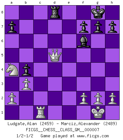 Last move : 1/2-1/2 2021 September 25 7:45:27 [Event "FICGS__CHESS__CLASS_GM__000007"] [Site "FICGS"] [Date "2021.09.18"] [Round "1"] [White "Ludgate,Alan"] [Black "Marciz,Alexander"] [Result "1/2-1/2"] [WhiteElo "2459"] [BlackElo "2489"] 1.d4 d5 2.c4 c6 3.Nc3 Nf6 4.Nf3 e6 5.e3 Nbd7 6.Bd3 dxc4 7.Bxc4 b5 8.Bd3 Bb7 9.e4 b4 10.Na4 c5 11.e5 Nd5 12.O-O cxd4 13.Nxd4 Nxe5 14.Bb5+ Nd7 15.Re1 Rc8 16.b3 Be7 17.Rxe6 O-O 18.Nc6 Rxc6 19.Rxc6 Bxc6 20.Bxc6 N7f6 21.Bb2 Qd6 22.Bxf6 Bxf6 23.Bxd5 Rd8 24.Rc1 Qxd5 25.Qxd5 1/2-1/2 QGD Slav defense Kingside Castling by player White (move 12) Kingside Castling by player Black (move 17) This chess game ended in a draw. Follow this game move after move (download)It began to feel as though you were playing against Chess itself. - On playing against Robert Fischer. (Walter Shipman) Warum muß ich gegen diesen IDIOTEN verlieren? (Aaron Nimzowitsch) La estratégia requiere pensar, la táctica requiere observación. (Max Euwe) Même si vous avez un bon coup à faire, regardez toujours s'il n'y en a pas un qui lui soit préférable. (Pedro Damiano) The production of too many useful things results in too many useless people. (Karl Marx)