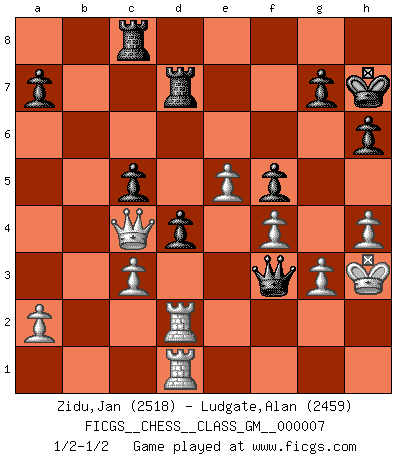 Last move : 1/2-1/2 2022 January 4 9:15:18 [Event "FICGS__CHESS__CLASS_GM__000007"] [Site "FICGS"] [Date "2021.09.18"] [Round "1"] [White "Zidu,Jan"] [Black "Ludgate,Alan"] [Result "1/2-1/2"] [WhiteElo "2518"] [BlackElo "2459"] 1.e4 e5 2.Nf3 Nf6 3.Nxe5 d6 4.Nf3 Nxe4 5.d4 d5 6.Bd3 Be7 7.O-O Nc6 8.Nbd2 Nxd2 9.Bxd2 Bg4 10.c3 O-O 11.h3 Bh5 12.g3 Qd7 13.Kg2 Bg6 14.Bf4 Be4 15.Re1 f5 16.Kh2 Bd6 17.Ne5 Qe7 18.f3 Bxe5 19.Bxe5 Nxe5 20.dxe5 Bxd3 21.Qxd3 Rad8 22.f4 c5 23.Rad1 Qe6 24.Rd2 Rf7 25.Red1 Rfd7 26.b4 b6 27.bxc5 bxc5 28.h4 h6 29.Qb5 Rc8 30.Kg2 Kh7 31.Qb3 Qc6 32.Kh3 d4 33.Qc4 Qf3 1/2-1/2 Petrov : Classical attack Kingside Castling by player White (move 7) Kingside Castling by player Black (move 10) This chess game ended in a draw. Follow this game move after move (download)For me, Chess is life and every game is like a new life. Every Chess player gets to live many lives in one lifetime. (Eduard Gufeld) Das Blackmar-Diemer-Gambit verändert den ganzen Menschen! (Emil Joseph Diemer) Yo considero que Fischer es uno de los expertos mas grandes de aperturas de siempre. (Keith Hayward) Les écrivains ont utilisé les échecs pour analyser les côtés extrêmes de la nature humaine. Dans ce cadre, les échecs offrent un champ d'expérimentation idéal. Mais on pourrait faire la même chose avec la peinture. Et là, en vous référant à Van Gogh, vous ne tirerez pas de conclusion définitive sur les peintres. (Gary Kasparov) Horse racing is animated roulette. (Roger Kahn)