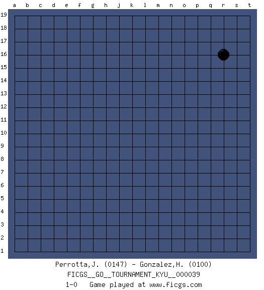 Last move : 1-0 2007 August 20 4:30:30 [Event "FICGS__GO__TOURNAMENT_KYU__000039"] [Site "FICGS"] [Date "2007.07.20"] [Round "1"] [Black "Perrotta,John Zach"] [White "Gonzalez,Hector"] [Result "1-0"] [Rating 1 "0147"] [Rating 2 "0100"] 1.r16 1-0 This go game has been lost on time (started : 2007.07.20 6:17:41) Here are the names of the openings (joseki) played in the four corners : Player Black won this Go (weiqi, baduk) game. Follow this game move after move (download)Very few good moves are played. (Pierre Audouard) Coffee just isn't my cup of tea. (Unknown)