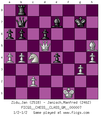 Last move : 1/2-1/2 2021 December 8 10:44:2 [Event "FICGS__CHESS__CLASS_GM__000007"] [Site "FICGS"] [Date "2021.09.18"] [Round "1"] [White "Zidu,Jan"] [Black "Janisch,Manfred"] [Result "1/2-1/2"] [WhiteElo "2518"] [BlackElo "2462"] 1.e4 c5 2.Nf3 d6 3.d4 cxd4 4.Nxd4 Nf6 5.Nc3 a6 6.f3 e5 7.Nb3 Be6 8.Be3 h5 9.Qd2 Nbd7 10.Nd5 Nxd5 11.exd5 Bf5 12.Na5 Rb8 13.a4 Be7 14.Nc4 b6 15.Be2 Bh4+ 16.g3 Be7 17.h4 O-O 18.O-O Nf6 19.b4 e4 20.Rae1 Qc7 21.Bd4 Nxd5 22.fxe4 Bxe4 23.Bxh5 f5 24.Bxg7 Kxg7 25.Rxe4 fxe4 26.Qxd5 Rxf1+ 27.Kxf1 Qb7 1/2-1/2 Sicilian : Najdorf Kingside Castling by player Black (move 17) Kingside Castling by player White (move 18) This chess game ended in a draw. Follow this game move after move (download)If one piece is badly posted, the whole game is bad. (Tarrasch) Frage: Was machen Sie mit den Preisen? Anwort: Ich habe Angst, dass meine Freundin davon neue Kleider kauft. (Loek van Wely) Aunque la mayoría de la gente disfruta observar las partidas de los grandes Maestros de ataque, algunos de los jugadores mas notables en la historia han sido los jugadores silenciosos posicionales. Lentamente ellos te aplastan despojandote de tu espacio, congestionando tus piezas y dejandote virtualmente sin nada que hacer. (Yasser Seirawan) Vouloir jouer aux échecs contre soi-même est aussi paradoxal que vouloir marcher sur son ombre. (Stefan Zweig) Coffee just isn't my cup of tea. (Unknown)