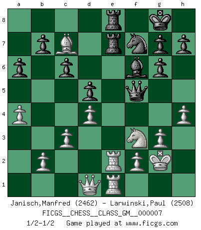 Last move : 1/2-1/2 2021 September 24 21:19:52 [Event "FICGS__CHESS__CLASS_GM__000007"] [Site "FICGS"] [Date "2021.09.18"] [Round "1"] [White "Janisch,Manfred"] [Black "Larwinski,Paul"] [Result "1/2-1/2"] [WhiteElo "2462"] [BlackElo "2508"] 1.e4 e5 2.Nf3 Nf6 3.Nxe5 d6 4.Nf3 Nxe4 5.d4 d5 6.Bd3 Nc6 7.O-O Be7 8.Nbd2 Nxd2 9.Bxd2 Bg4 10.c3 O-O 11.h3 Bh5 12.g3 Qd7 13.Kg2 Bg6 14.Bf4 Rae8 15.Bxg6 fxg6 16.Qc2 Nd8 17.Rae1 Bf6 18.Be5 Re7 19.Re2 Rfe8 20.Rfe1 Nf7 21.h4 c6 22.a4 a6 23.Qd1 Qf5 24.Bc7 1/2-1/2 Petrov : Classical attack Kingside Castling by player White (move 7) Kingside Castling by player Black (move 10) This chess game ended in a draw. Follow this game move after move (download)Even the laziest King flees wildly in the face of a double check ! (Aaron Nimzowitsch) Strategie ist, wie man ein Mädchen auf den Rücksitz bekommt. Taktik ist, was man tut, wenn man dann dort ist. (Anonymous) Cuando la partida de Ajedrez termina, el Peón y el Rey regresan a la misma caja. (Irish saying) Les sacrifices démontrent seulement que quelqu'un a gaffé. (Savielly Tartacover) Those who make the worst use of their time are the first to complain of its brevity. (Jean de la Bruyere)