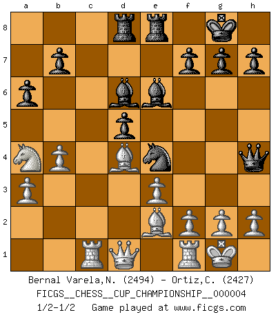 Last move : 1/2-1/2 2021 October 6 21:32:17 [Event "FICGS__CHESS__CUP_CHAMPIONSHIP__000004"] [Site "FICGS"] [Date "2021.09.20"] [Round "1"] [White "Bernal Varela,Nelson"] [Black "Ortiz,Clodomiro"] [Result "1/2-1/2"] [WhiteElo "2494"] [BlackElo "2427"] 1.Nf3 Nf6 2.d4 d5 3.c4 e6 4.e3 Be7 5.Nc3 O-O 6.b3 c5 7.dxc5 Bxc5 8.cxd5 Bb4 9.Bd2 exd5 10.a3 Bd6 11.Be2 a6 12.Bc1 Be6 13.O-O Qe7 14.Bb2 Nc6 15.Na4 Ne4 16.b4 Rfe8 17.Rc1 Rad8 18.Nd4 Nxd4 19.Bxd4 Qh4 1/2-1/2 Reti Opening Kingside Castling by player Black (move 5) Kingside Castling by player White (move 13) This chess game ended in a draw. Follow this game move after move (download)Chess is so inspiring that I do not believe a good player is capable of having an evil thought during the game. (Wilhelm Steinitz) Kombinieren und Schwarzhandel gehören verboten. (Savielly Grigorievitsch Tartakower) La estratégia requiere pensar, la táctica requiere observación. (Max Euwe) La victoire dans une partie d'Echecs appartient la plupart du temps à celui qui voit un peu plus loin que l'adversaire. (Lasker) For a mechanic, you seem to do an excessive amount of thinking. (C-3PO in Star Wars ep.2)