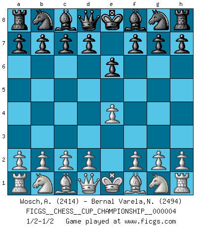 Last move : 1/2-1/2 2021 September 20 21:49:39 [Event "FICGS__CHESS__CUP_CHAMPIONSHIP__000004"] [Site "FICGS"] [Date "2021.09.20"] [Round "1"] [White "Wosch,Arkadiusz"] [Black "Bernal Varela,Nelson"] [Result "1/2-1/2"] [WhiteElo "2414"] [BlackElo "2494"] 1.e4 e6 1/2-1/2 French defense This chess game ended in a draw. Follow this game move after move (download)Chess is 99 percent tactics. (Teichmann) Dieses schreckliche Gefühl, dass ich gegen eine Maschine spielte, die niemals Fehler macht, zerschmetterte meinen Widerstand. (Mark Taimanov) Evita las multitudes. Haz independientemente tu propio razonamiento. Trata de ser el jugador de Ajedrez, no la pieza de Ajedrez. (Ralph Charell) Le jeu d'échecs fait naître et fortifie en nous plusieurs qualités précieuses dans le cours de l'existence, telles que la prévoyance, la circonspection, la prudence, et la persévérance. (Benjamin Franklin - 1783, la morale des échecs) Only sick music makes money today. (Friedrich Nietzsche)