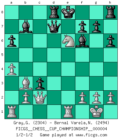 Last move : 1/2-1/2 2021 October 7 4:54:26 [Event "FICGS__CHESS__CUP_CHAMPIONSHIP__000004"] [Site "FICGS"] [Date "2021.09.20"] [Round "1"] [White "Gray,Garvin"] [Black "Bernal Varela,Nelson"] [Result "1/2-1/2"] [WhiteElo "2304"] [BlackElo "2494"] 1.e4 e6 2.d4 d5 3.Nd2 c5 4.Ngf3 cxd4 5.exd5 Qxd5 6.Bc4 Qd7 7.O-O Nc6 8.Nb3 Nf6 9.Nfxd4 Nxd4 10.Nxd4 a6 11.Bg5 b5 12.Bb3 Bb7 13.c3 h6 14.Bh4 Be7 15.Re1 Rd8 16.a4 b4 17.Qc2 bxc3 18.Bxf6 Bxf6 19.Nxe6 1/2-1/2 French : Tarrasch, Open variation Kingside Castling by player White (move 7) This chess game ended in a draw. Follow this game move after move (download)White lost because he failed to remember the right continuation and had to think up the moves himself. (Siegbert Tarrasch) Jeder leidlich begabte Spieler, er braucht keineswegs hervorragend veranlagt zu sein, kann es zum Meister bringen. Aber das ist ja auch gar nicht nötig! Der richtige Standpunkt ist es, zu seinem Vergnügen zu spielen, und man glaube ja nicht, dass der Genuss proportional dem Können sei. (Siegbert Tarrasch) Buenas posiciones no logran ganar juegos, buenas movidas sí. (Gerald Abrahams) Que feriez-vous si vous étiez en train de jouer aux échecs et que la fin du monde arrive ? Je continuerais à jouer. (Saint Borromée) The best teachers teach from the heart, not from the book. (Author unknown)