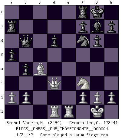 Last move : 1/2-1/2 2021 September 30 15:49:30 [Event "FICGS__CHESS__CUP_CHAMPIONSHIP__000004"] [Site "FICGS"] [Date "2021.09.20"] [Round "1"] [White "Bernal Varela,Nelson"] [Black "Grammatica,Andrea"] [Result "1/2-1/2"] [WhiteElo "2494"] [BlackElo "2244"] 1.Nf3 Nf6 2.d4 g6 3.c4 Bg7 4.Nc3 d5 5.Qb3 dxc4 6.Qxc4 O-O 7.e4 a6 8.Qb3 b5 9.Be2 c5 10.dxc5 Be6 11.Qc2 Nbd7 12.Be3 Rc8 13.Rd1 b4 14.Nd5 Bxd5 15.exd5 Nxc5 16.O-O a5 17.Rfe1 Ncd7 18.Qb1 Nb6 19.Ba6 Ra8 20.Qd3 Qb8 21.Bxb6 Qxb6 22.Bc4 Ra7 23.d6 exd6 1/2-1/2 Reti Opening Kingside Castling by player Black (move 6) Kingside Castling by player White (move 16) This chess game ended in a draw. Follow this game move after move (download)Don't even mention losing to me. I can't stand to think of it. (Bobby Fischer) Wenn ich mich einlogge, glauben die Leute gewöhnlich nicht, dass ich es selbst bin und sie fangen an, mir dumme Fragen zu stellen. Und wenn sie es glauben, stellen sie wieder andere dumme Fragen. (Judith Polgar) Si no le temes a Spassky, entonces elimino el elemento del dinero. (Jim Slater) Le profane ne songe pas à la somme de jouissance dont il se prive, qui méconnaît ce jeu aux ressources aussi variées que passionnantes. (Jean-Marie Jeanton-Lamarche) If you don't practice you don't deserve to win. (Andre Agassi)