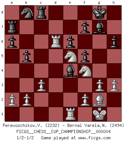 Last move : 1/2-1/2 2021 September 27 6:37:1 [Event "FICGS__CHESS__CUP_CHAMPIONSHIP__000004"] [Site "FICGS"] [Date "2021.09.20"] [Round "1"] [White "Perevozchikov,Vjacheslav"] [Black "Bernal Varela,Nelson"] [Result "1/2-1/2"] [WhiteElo "2232"] [BlackElo "2494"] 1.d4 e6 2.e4 d5 3.Nc3 Nf6 4.Bg5 dxe4 5.Nxe4 Be7 6.Bxf6 gxf6 7.Nf3 f5 8.Nc3 a6 9.g3 b5 10.Bg2 Bb7 11.O-O c5 12.dxc5 Qxd1 13.Raxd1 Bxc5 14.Rfe1 Ra7 15.Ne5 O-O 16.Ne2 Rc8 17.c3 Bf8 18.h3 Bg7 19.Nf4 h6 20.Rd6 Be4 1/2-1/2 Queen's pawn Kingside Castling by player White (move 11) Kingside Castling by player Black (move 15) This chess game ended in a draw. Follow this game move after move (download)A sacrifice is best refuted by accepting it. (Wilhelm Steinitz) Kasparov stellt für gewöhnlich die Regeln auf und bricht sie dann selbst wieder. (Alexej Shirov) Hay jugadores fuertes y personas amables y yo soy un jugador fuerte. (Bobby Fischer) Dans le domaine de la peinture, de la gravure et de la sculpture, dès la première décennie de notre siècle, les artistes abandonnent la représentation de la partie d'échecs pour se concentrer sur les pièces, sur les échiquiers et sur toutes les variations auxquelles les unes et les autres peuvent donner lieu. On passe en quelque sorte d'un thème social à un thème musical (au sens de la musica médiévale, c'est-à-dire d'une notion qui inclue le rythme, l'harmonie, la construction et la déconstruction, etc.). Graphiquement et picturalement, l'échiquier apparaît comme une structure ouverte, dynamique, d'une richesse infinie, autorisant toutes les combinatoires et débouchant sur des mouvements et des rythmes de nature exponentielle. (Michel Pastoureau) The real danger is not that computers will begin to think like men, but that men will begin to think like computers. (Sydney J. Harris)