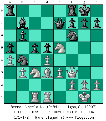 Last move : 1/2-1/2 2021 October 5 23:24:16 [Event "FICGS__CHESS__CUP_CHAMPIONSHIP__000004"] [Site "FICGS"] [Date "2021.09.20"] [Round "1"] [White "Bernal Varela,Nelson"] [Black "Ligon,Scott"] [Result "1/2-1/2"] [WhiteElo "2494"] [BlackElo "2207"] 1.Nf3 Nf6 2.d4 d5 3.c4 e6 4.e3 Nbd7 5.Nc3 a6 6.b3 b6 7.Bd3 Bb7 8.O-O Bd6 9.a4 O-O 10.cxd5 exd5 11.Ba3 Bxa3 12.Rxa3 a5 13.Ra1 Nb8 14.Ne5 Na6 15.Qf3 Nb4 16.Rfd1 Qe7 17.Rac1 c5 18.Qg3 Nh5 19.Qf3 Nf6 1/2-1/2 Reti Opening Kingside Castling by player White (move 8) Kingside Castling by player Black (move 9) This chess game ended in a draw. Follow this game move after move (download)By the beauty of his games, the clarity of his play, and the brilliance of his ideas, Fischer made himself an artist of the same stature as Brahms, Rembrandt, and Shakespeare. (David Levy) Mein Name ist Rustam Kamsky. Sie haben meinen Sohn belästigt. Bereiten Sie sich aufs Sterben vor. (Rustam Kamsky) A la fecha, Fischer esta simplemente un nivel arriba de todos los mejores jugadores de Ajedrez del mundo. (John Jacobs) Toute estimation doit être constamment réévaluée. (Jacob Estrin) If only people were all showed a certain minimum level of niceness; if only people didn't retract verbal draw offers (without draw box ticked) on ficgs; if only people didn't kill; if only people didn't run concentration / extermination camps, if only people didn't drop nuclear bombs on Hiroshima and Nagasaki, and so on - it would be a much more beautiful world. But sadly, things are not so... (Normajean Yates)