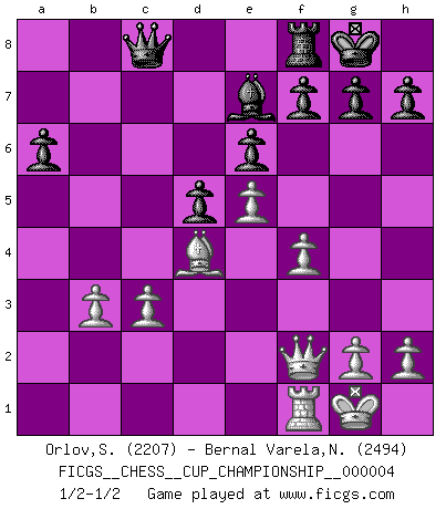 Last move : 1/2-1/2 2021 October 3 10:51:2 [Event "FICGS__CHESS__CUP_CHAMPIONSHIP__000004"] [Site "FICGS"] [Date "2021.09.20"] [Round "1"] [White "Orlov,Vladimir"] [Black "Bernal Varela,Nelson"] [Result "1/2-1/2"] [WhiteElo "2207"] [BlackElo "2494"] 1.e4 e6 2.d4 d5 3.Nc3 Nf6 4.e5 Nfd7 5.f4 c5 6.Nf3 cxd4 7.Nxd4 Nc6 8.Be3 Qb6 9.Qd2 Qxb2 10.Rb1 Qa3 11.Bb5 Nxd4 12.Bxd4 a6 13.Bxd7+ Bxd7 14.Rb3 Qe7 15.Rxb7 Rc8 16.O-O Qd8 17.Qf2 Rxc3 18.Bxc3 Qc8 19.Rb3 Ba4 20.Bd4 Bxb3 21.axb3 Be7 22.c3 O-O 1/2-1/2 French : Steinitz variation Kingside Castling by player White (move 16) Kingside Castling by player Black (move 22) This chess game ended in a draw. Follow this game move after move (download)The only thing Chess players have in common is Chess. (Lodewijk Prins) Garry Kasparov war erst in der Großmeister-Organisation GMA, dann in der Profischach-Vereinigung PCA, zum Schluss kehrte er wieder in den Schoß der FIDE zurück. Aber gut, manche Leute sind flexibel (Viswanathan Anand) Las ideas audaces son como las piezas del Ajedrez que avanzan hacia adelante. Ellas pueden ser vencidas, pero también pueden iniciar una partida victoriosa. (Goethe) Les Echecs ne sont pas pour les âmes timides. Ils requièrent un homme entier, qui ne s'arrête pas aveuglément à ce qui a été déjà établi, mais qui tente individuellement de sonder les profondeurs du jeu. (W. Steinitz) The greatest con, that he ever pulled... was making you believe... that he is you. (Revolver, movie)