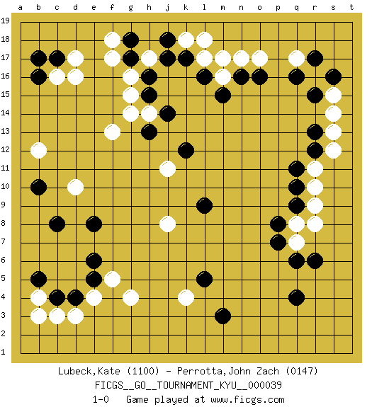 Last move : 1-0 2007 October 15 0:39:28 [Event "FICGS__GO__TOURNAMENT_KYU__000039 "] [Site "FICGS"] [Date "2007.07.20"] [Round "1"] [Black "Lubeck,Kate "] [White "Perrotta,John Zach "] [Result "1-0"] [Rating 1 "1100"] [Rating 2 "0147"] 1.q16 c3 2.d4 d16 3.q4 o17 4.o16 q17 5.n16 n17 6.l16 l17 7.k17 m17 8.h16 d10 9.q11 r8 10.r6 r11 11.q10 r10 12.q9 r9 13.p7 q8 14.p8 q7 15.r12 s12 16.r13 s13 17.r15 s15 18.s16 s14 19.q6 k4 20.m3 g4 21.l5 f13 22.h13 d3 23.c4 e4 24.c8 j8 25.l9 g16 26.h15 g15 27.b10 b12 28.e8 j11 29.k12 b4 30.b5 b3 31.e5 f5 32.e6 h17 33.j17 g14 34.r17 h14 35.j14 m16 36.m15 k18 37.j18 l18 38.g17 f17 39.g18 f18 40.c17 c16 41.b17 d17 42.b16 1-0 This go game has been lost on time (started : 2007.07.20 6:17:41) Here are the names of the openings (joseki) played in the four corners : Corner d4 : c3 d4San-San (Sam-Sam, San-San) 3-3 Point. The San-San (3-3) point, emphasizing territory at the expense of influence.Kata-tsuki (shoulder hit). The shoulder-hit is the traditional answer to the 3-3. The direction of White 3 depends on the positions on the side. Crawling once may be the premise for a follow-up move of sliding with a knight's move in the opposite direction. If White plays 3 at 3-4 (to the right), the follow-on knight's move is then played at the top (e.g. 3-4, 4-5, 5-2). White's knight's move reduces territory potential on the side it is played. Corner q16 : q16 o17Hoshi (Hwajeom, Seongjeom, Xingwei`) 4-4 Point. The star or hoshi (4-4) point, emphasizing influence at the potential expense of territory.Ikken Kakari (Hankan Keolch'im, Yi Gua`jiao~, 1-Space Low Approach). White 2 is the standard approach move to the 4-4. Corner d16 : d16 h16Hoshi (Hwajeom, Seongjeom, Xingwei`) 4-4 Point. The star or hoshi (4-4) point, emphasizing influence at the potential expense of territory. Corner q4 : q4 r8Hoshi (Hwajeom, Seongjeom, Xingwei`) 4-4 Point. The star or hoshi (4-4) point, emphasizing influence at the potential expense of territory. Player Black won this Go (weiqi, baduk) game.Follow this game move after move (download ) Error is one of the sources of transformation. (Pierre Audouard) Life is like internet, nothing interesting, but noone want to leave it. (Ilmars Cirulis)