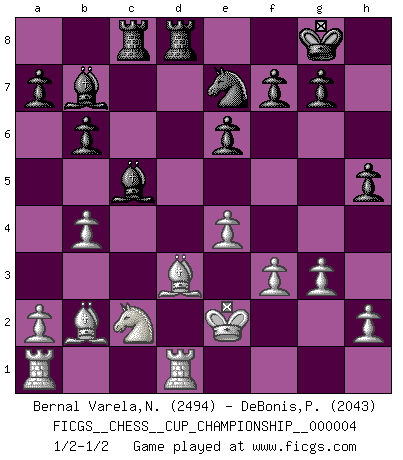 Last move : 1/2-1/2 2021 October 2 12:44:19 [Event "FICGS__CHESS__CUP_CHAMPIONSHIP__000004"] [Site "FICGS"] [Date "2021.09.20"] [Round "1"] [White "Bernal Varela,Nelson"] [Black "DeBonis,Patrick"] [Result "1/2-1/2"] [WhiteElo "2494"] [BlackElo "2043"] 1.Nf3 Nf6 2.d4 e6 3.c4 d5 4.e3 Be7 5.Nc3 O-O 6.b3 c5 7.dxc5 dxc4 8.Bxc4 Qxd1+ 9.Kxd1 Nbd7 10.Na4 Nxc5 11.Nxc5 Bxc5 12.Ke2 Rd8 13.Bb2 b6 14.Rhd1 Bb7 15.Ne1 Ne4 16.f3 Nd6 17.Bd3 Nf5 18.Nc2 Rac8 19.g3 h5 20.e4 Ne7 21.b4 1/2-1/2 Reti Opening Kingside Castling by player Black (move 5) This chess game ended in a draw. Follow this game move after move (download)Bobby just drops the pieces and they fall on the right squares. (Miguel Najdorf) Frage: Gibt es etwas was Sie mehr lieben als Autobahnen ohne Tempobegrenzungen? - Antwort: Deutsche Frauen ohne Tempobegrenzungen. (Loek van Wely) Después de una mala apertura, hay una esperanza en el juego medio. Pero una vez que estas en finales, el momento de la verdad ha llegado. (Edmar Mednis) La conception d'un plan est le processus par lequel un joueur exploite les avantages de sa position tout en s'efforçant d'en réduire au minimum les inconvénients. Afin de garantir le succès, un plan doit toujours se fonder sur un diagnostic objectif des particularités d'une position. La conception d'un plan est d'autant plus difficile que la position est équilibrée, et grandement facilitée lorsqu'il n'existe qu'un seul plan susceptible de répondre aux exigences de la position. (Harry Golombek) If you have any trouble condescending, find a Unix user to show you how it's done. (Scott Adams)