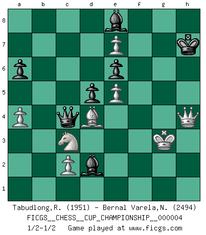 Last move : 1/2-1/2 2021 October 10 23:16:10 [Event "FICGS__CHESS__CUP_CHAMPIONSHIP__000004"] [Site "FICGS"] [Date "2021.09.20"] [Round "1"] [White "Tabudlong,Ronnie"] [Black "Bernal Varela,Nelson"] [Result "1/2-1/2"] [WhiteElo "1951"] [BlackElo "2494"] 1.d4 e6 2.e4 d5 3.Nc3 Nf6 4.e5 Nfd7 5.f4 c5 6.Nf3 cxd4 7.Nxd4 Nc6 8.Be3 Qb6 9.Qd2 Qxb2 10.Rb1 Qa3 11.Bb5 Nxd4 12.Bxd4 a6 13.Bxd7+ Bxd7 14.Rb3 Qe7 15.Rxb7 Rc8 16.O-O Qd8 17.Qe3 Rc4 18.Rfb1 Be7 19.f5 Bg5 20.Qd3 O-O 21.f6 Bc6 22.Re7 h6 23.g3 h5 24.h4 Bh6 25.Rb6 Qa8 26.a3 g6 27.g4 hxg4 28.Kf2 Re8 29.Kg3 Rxe7 30.fxe7 Bd7 31.a4 Qc8 32.h5 Rc6 33.Rxc6 Qxc6 34.hxg6 Be8 35.gxf7+ Bxf7 36.Qe2 Bh5 37.Kh4 Be8 38.Qxg4+ Kh7 39.Kh3 Qc4 40.Kg3 Bd2 41.Qh4+ 1/2-1/2 Queen's pawn Kingside Castling by player White (move 16) Kingside Castling by player Black (move 20) This chess game ended in a draw. Follow this game move after move (download)Life is like a game of Chess, changing with each move. (Chinese proverb) Die Leute spielen gegen mich seit 15 Jahren unter Ihren Möglichkeiten. (Robert James Fischer) Fischer sacrificó virtualmente todo lo que la mayoría de nosotros los 'debiles' (término que él usa) valoramos, respetamos y apreciamos por el amor de un astuto, a menudo hermoso tablero de juego, por el privilegio ambivalente de ser su mas grande maestro. (Paul Kollar) Que feriez-vous si vous étiez en train de jouer aux échecs et que la fin du monde arrive ? Je continuerais à jouer. (Saint Borromée) Children in the dark cause accidents, accidents in the dark cause children. (Unknown)
