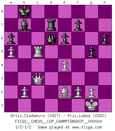 Last move : 1/2-1/2 2021 November 20 21:52:34 [Event "FICGS__CHESS__CUP_CHAMPIONSHIP__000004"] [Site "FICGS"] [Date "2021.09.20"] [Round "1"] [White "Ortiz,Clodomiro"] [Black "Fric,Lubos"] [Result "1/2-1/2"] [WhiteElo "2427"] [BlackElo "2320"] 1.d4 Nf6 2.c4 e6 3.Nf3 d5 4.Nc3 c6 5.Bg5 h6 6.Bh4 dxc4 7.e4 g5 8.Bg3 b5 9.Be2 Bb7 10.O-O Nbd7 11.Ne5 Bg7 12.Nxd7 Nxd7 13.Bd6 a6 14.a4 b4 15.Bxb4 Qb6 16.Ba3 Qxd4 17.Qc2 Qe5 18.Bxc4 Qc7 19.Rad1 Be5 20.Qb3 O-O-O 21.a5 c5 22.Na4 Bxh2+ 23.Kh1 Bd6 24.Be2 Rhg8 25.Rxd6 Qxd6 26.Bxc5 Nxc5 27.Rc1 Rd7 28.Nxc5 Rc7 29.Rc4 Rxc5 30.Qb4 Kb8 31.Rxc5 Rd8 32.Kg1 Rd7 33.Qc3 1/2-1/2 Queen's pawn game Kingside Castling by player White (move 10) Queenside Castling by player Black (move 20) This chess game ended in a draw. Follow this game move after move (download)We cannot resist the fascination of sacrifice, since a passion for sacrifices is part of a Chessplayer's nature. (Rudolf Spielman) Schach ist das schnellste Spiel der Welt, weil man in jeder Sekunde Tausende von Gedanken ordnen muß. (Albert Einstein) Tu puedes aprender mucho mas de una partida que pierdas que de una partida ganada. Tendras que perder cientos de partidas antes de llegar a ser un buen jugador. (Jose Raul Capablanca) Le pion, dans sa simplicité, marche droit devant lui, mais lorsqu'il prend, il le fait obliquement? Ainsi l'homme, tant qu'il reste pauvre, marche dans la droiture et vit honnêtement, mais lorsqu'il recherche les honneurs, il flatte, se parjure et, par les voies obliques, cherche une position supérieure sur l'échiquier du monde. (Jean de Galles) I think your argument is specious - I think your tie is ugly. (Gregory House to Dr. Foreman, House M.D.)