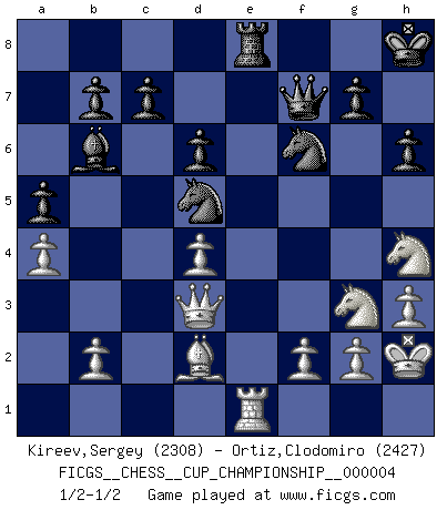 Last move : 1/2-1/2 2021 October 13 13:14:18 [Event "FICGS__CHESS__CUP_CHAMPIONSHIP__000004"] [Site "FICGS"] [Date "2021.09.20"] [Round "1"] [White "Kireev,Sergey"] [Black "Ortiz,Clodomiro"] [Result "1/2-1/2"] [WhiteElo "2308"] [BlackElo "2427"] 1.e4 e5 2.Nf3 Nc6 3.Bb5 Nf6 4.d3 Bc5 5.Ba4 d6 6.O-O O-O 7.c3 h6 8.h3 Bb6 9.Nbd2 Be6 10.Re1 Nd7 11.Nf1 f5 12.exf5 Bxf5 13.Ng3 Bh7 14.Be3 Kh8 15.d4 exd4 16.cxd4 Nb4 17.a3 Nd5 18.Bc2 Qf6 19.Bxh7 Kxh7 20.Bd2 Qf7 21.Qb1+ Kh8 22.Qd3 a5 23.a4 Rae8 24.Kh2 N7f6 25.Nh4 Rxe1 26.Rxe1 Re8 1/2-1/2 Ruy Lopez : Berlin defense Kingside Castling by player White (move 6) Kingside Castling by player Black (move 6) This chess game ended in a draw. Follow this game move after move (download)Bobby Fischer is the greatest Chess genius of all time ! (Alexander Kotov) Charakterschwächen offenbaren sich normalerweise während einer Schachpartie. (Garry Kasparov) La vida es como el Ajedrez, con lucha, competición y eventos buenos y malos. (Benjamin Franklin) Les Echecs représentent une sphère d'idées créatrices basée sur la volonté des deux protagonistes. (Smyslov) The ego is not master in its own house. (Sigmund Freud)
