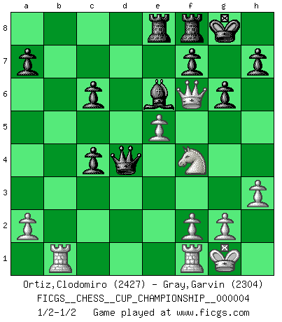 Last move : 1/2-1/2 2021 October 18 15:21:1 [Event "FICGS__CHESS__CUP_CHAMPIONSHIP__000004"] [Site "FICGS"] [Date "2021.09.20"] [Round "1"] [White "Ortiz,Clodomiro"] [Black "Gray,Garvin"] [Result "1/2-1/2"] [WhiteElo "2427"] [BlackElo "2304"] 1.d4 Nf6 2.c4 g6 3.Nc3 d5 4.cxd5 Nxd5 5.Bd2 Bg7 6.e4 Nxc3 7.Bxc3 O-O 8.Qd2 c5 9.d5 e6 10.Bc4 exd5 11.Bxd5 Nc6 12.Ne2 Be6 13.Bxc6 bxc6 14.Bxg7 Kxg7 15.Qc3+ Qf6 16.e5 Qh4 17.O-O Qb4 18.Qc1 Rad8 19.Qg5 Qxb2 20.Nf4 Kg8 21.h3 c4 22.Rab1 Qd4 23.Qf6 Rde8 1/2-1/2 King's Indian defense, 3.Nc3 Kingside Castling by player Black (move 7) Kingside Castling by player White (move 17) This chess game ended in a draw. Follow this game move after move (download)Discovered check is the dive bomber of the Chessboard. (Reuben Fine) Man kann eine Schachpartie nur gewinnen, wenn das Gleichgewicht gestört ist. In einer Stellung mit ungestörtem Gleichgewicht ist auch das größte Genie hilflos - in der Stellung steckt dann eben kein genialer Einfall. (Wilhelm Steinitz) A la fecha, Fischer esta simplemente un nivel arriba de todos los mejores jugadores de Ajedrez del mundo. (John Jacobs) Lorsque vous vous retrouvez devant une position atroce, ne tendez pas un ultime piège dérisoire avec l'intention d'abandonner si l'adversaire le déjoue ! Faites-vous plutôt un devoir de résister comme si votre vie en dépendait. Jouez le coup qui vous déplairait au centuple si vous étiez dans la peau de votre tortionnaire ! There's always a bigger fish. (Qui-Gon Jinn in Star Wars ep.1)