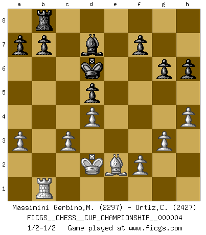 Last move : 1/2-1/2 2021 November 16 23:28:10 [Event "FICGS__CHESS__CUP_CHAMPIONSHIP__000004"] [Site "FICGS"] [Date "2021.09.20"] [Round "1"] [White "Massimini Gerbino,Massimiliano"] [Black "Ortiz,Clodomiro"] [Result "1/2-1/2"] [WhiteElo "2297"] [BlackElo "2427"] 1.d4 Nf6 2.c4 e6 3.Nf3 d5 4.Nc3 Bb4 5.Bg5 h6 6.Bxf6 Qxf6 7.e3 c5 8.cxd5 exd5 9.Be2 cxd4 10.Qxd4 Qxd4 11.Nxd4 Be6 12.Rc1 Ke7 13.a3 Bxc3+ 14.Rxc3 Nc6 15.Kd2 Nxd4 16.exd4 Rhc8 17.Rb3 Rab8 18.h4 Bf5 19.Re3+ Kd6 20.Rc3 Rxc3 21.bxc3 Bd7 22.g3 g6 23.Rb1 1/2-1/2 Queen's pawn game This chess game ended in a draw. Follow this game move after move (download)Pawn endings are to Chess what putting is to golf. (Cecil Purdy) Ich möchte Schüler heranbilden, die das Vermögen haben, selbst zu denken und Kritik zu üben. (Emanuel Lasker) Las ideas audaces son como las piezas del Ajedrez que avanzan hacia adelante. Ellas pueden ser vencidas, pero también pueden iniciar una partida victoriosa. (Goethe) Un footballeur joue avec ses pieds, parfois avec sa tête. Un joueur d'échecs ne joue qu'avec sa tête. Et quand il ne joue plus, il meurt. (Jacob Murray) I can't decide which is riskier; taking crazy risks, or taking advice on crazy risks from a crazy risk taker. (Gregory House in House M.D.)