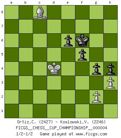 Last move : 1/2-1/2 2022 January 26 15:16:6 [Event "FICGS__CHESS__CUP_CHAMPIONSHIP__000004"] [Site "FICGS"] [Date "2021.09.20"] [Round "1"] [White "Ortiz,Clodomiro"] [Black "Koslowski,Volker"] [Result "1/2-1/2"] [WhiteElo "2427"] [BlackElo "2246"] 1.d4 Nf6 2.c4 e6 3.Nf3 d5 4.Nc3 dxc4 5.e4 Bb4 6.Bxc4 Nxe4 7.O-O Nf6 8.Qa4+ Nc6 9.Ne5 Rb8 10.Rd1 Bd6 11.Nxc6 bxc6 12.Qxa7 Bd7 13.Bf1 O-O 14.Qa6 h6 15.a4 Rb4 16.a5 c5 17.dxc5 Bxc5 18.h3 Qe7 19.Qe2 Bc6 20.a6 Nd5 21.Qc2 Ba8 22.Ra3 Nf4 23.Na2 Re4 24.Rb3 Ng6 25.Nc3 Re5 26.Na4 Ba7 27.Be3 Bxe3 28.Rxe3 Rxe3 29.fxe3 Qg5 30.Qf2 Bc6 31.Ra1 Rb8 32.Ra3 Nh4 33.a7 Ra8 34.Nc3 Nf5 35.Nb5 Qe7 36.e4 Bxe4 37.Qf4 Qb4 38.Qxc7 Qxb2 39.Qc3 Qxc3 40.Rxc3 Nd4 41.Nxd4 Rxa7 42.Nb5 Rd7 43.Kf2 Bb7 44.Ra3 Rd2+ 45.Kg1 g5 46.Ra7 Bc6 47.Ra6 Bxb5 48.Bxb5 Rb2 49.Bc6 Kg7 50.Ra7 Rb8 51.Rb7 Rxb7 52.Bxb7 f5 53.Kf2 h5 54.Ke3 Kf6 55.Kd4 h4 56.Bc8 g4 1/2-1/2 Queen's pawn game Kingside Castling by player White (move 7) Kingside Castling by player Black (move 13) 10 pieces endgame at move 51 : White KBPP , Black KRPPPP WHITE : King + 1 Bishop 2 Pawns BLACK : King + 1 Rook 4 Pawns 9 pieces endgame at move 52 : White KBPP , Black KPPPP WHITE : King + 1 Bishop 2 Pawns BLACK : King + 4 Pawns This chess game ended in a draw. Follow this game move after move (download)After black's reply to 1.e4 with 1..e5, leaves him always trying to get into the game. (Howard Staunton) Jeder leidlich begabte Spieler, er braucht keineswegs hervorragend veranlagt zu sein, kann es zum Meister bringen. Aber das ist ja auch gar nicht nötig! Der richtige Standpunkt ist es, zu seinem Vergnügen zu spielen, und man glaube ja nicht, dass der Genuss proportional dem Können sei. (Siegbert Tarrasch) ¿Que sería del Ajedrez sin errores graciosos?. (Kurt Richter) On entre au jeu d'Echecs comme on entre en Religion. Pour le joueur d'Echecs, la partie d'Echecs c'est l'office, la messe, le défilé du 1er Mai, le dépôt de gerbe au Monument aux Morts. C'est un drame sacré. (Michel Roos) If we knew what we were doing, we would not call it research. (Albert Einstein)