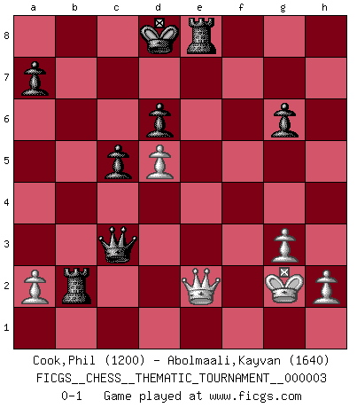 Last move : 0-1 2006 July 18 9:47:29 [Event "FICGS__CHESS__THEMATIC_TOURNAMENT__000003"] [Site "FICGS"] [Date "2006.06.24"] [Round "1"] [White "Cook,Phil"] [Black "Abolmaali,Kayvan"] [Result "0-1"] [WhiteElo "1200"] [BlackElo "1640"] 1.d4 Nf6 2.c4 c5 3.d5 b5 4.b3 bxc4 5.bxc4 d6 6.Nc3 Ba6 7.e4 Nbd7 8.Nf3 g6 9.Bd3 Bg7 10.O-O Nxe4 11.Qc2 Nxc3 12.Kh1 Nxd5 13.cxd5 Bxd3 14.Qxd3 Bxa1 15.Bh6 Bf6 16.g3 Ne5 17.Nxe5 Bxe5 18.f4 Bd4 19.f5 Qa5 20.Qe2 Rb8 21.fxg6 hxg6 22.Bg5 f6 23.Bxf6 Bxf6 24.Rxf6 Qc3 25.Re6 Rb1+ 26.Kg2 Rb2 27.Rxe7+ Kd8 28.Re8+ Rxe8 0-1 Benko gambit Kingside Castling by player White (move 10) Player Black won this chess game. Follow this game move after move (download)Chess is a matter of delicate judgment, knowing when to punch and how to duck. (Bobby Fischer) Mein erstes Ziel war nicht, die Partie zu gewinnen, sondern eine Figur zu opfern. -- der junge (Wilhelm Steinitz) No solamente yo pronostico su triunfo sobre Botvinnik, sino que me adelanto y digo que probablemente Fischer es el jugador de Ajedrez mas grande que haya existido. (John Collins) La vérité est comme le meilleur coup aux échecs : elle existe, mais il faut la chercher. (Arturo Perez-Reverte) Better than a thousand days of diligent study is one day with a great teacher. (Japanese proverb)