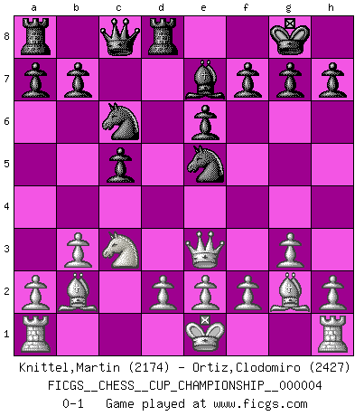 Last move : 0-1 2021 November 20 2:3:1 [Event "FICGS__CHESS__CUP_CHAMPIONSHIP__000004"] [Site "FICGS"] [Date "2021.09.20"] [Round "1"] [White "Knittel,Martin"] [Black "Ortiz,Clodomiro"] [Result "0-1"] [WhiteElo "2174"] [BlackElo "2427"] 1.Nf3 Nf6 2.c4 e6 3.g3 d5 4.Bg2 dxc4 5.Qa4+ Bd7 6.Qxc4 c5 7.Ne5 Qc8 8.Qd3 Nc6 9.Nxd7 Nxd7 10.b3 Be7 11.Nc3 Nde5 12.Qe3 O-O 13.Bb2 Rd8 0-1 This chess game has been lost on time (started : 2021.09.20 1:58:51) Reti Opening Kingside Castling by player Black (move 12) Player Black won this chess game. Follow this game move after move (download)For me, Chess is life and every game is like a new life. Every Chess player gets to live many lives in one lifetime. (Eduard Gufeld) Mein Name ist Rustam Kamsky. Sie haben meinen Sohn belästigt. Bereiten Sie sich aufs Sterben vor. (Rustam Kamsky) Yo siempre he tenido un ligero sentimiento de lástima por una persona que no tiene conocimiento del Ajedrez. (Siegbert Tarrasch) Aux échecs, les retours au sommet sont rares : les dommages psychologiques consécutifs à une défaite sont trop sévères. (Daily Telegraph) Cactus - It is depressed cucumber. (Ilmars Cirulis)
