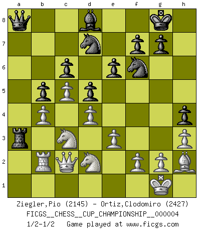Last move : 1/2-1/2 2021 October 23 19:21:56 [Event "FICGS__CHESS__CUP_CHAMPIONSHIP__000004"] [Site "FICGS"] [Date "2021.09.20"] [Round "1"] [White "Ziegler,Pio"] [Black "Ortiz,Clodomiro"] [Result "1/2-1/2"] [WhiteElo "2145"] [BlackElo "2427"] 1.d4 Nf6 2.c4 e6 3.Nf3 d5 4.Nc3 Be7 5.Bf4 O-O 6.e3 Nbd7 7.c5 c6 8.h3 b6 9.b4 a5 10.a3 Ba6 11.Bxa6 Rxa6 12.O-O Qa8 13.Qb1 Qb7 14.Qd3 b5 15.Nd2 Rfa8 16.Nb3 Bd8 17.Rfb1 Nf8 18.Be5 N8d7 19.Bh2 h5 20.Qd1 R8a7 21.Ne2 axb4 22.axb4 Ra4 23.Rxa4 Rxa4 24.Nd2 Qa8 25.Nc3 Ra3 26.Qc2 h4 27.Rb2 1/2-1/2 Queen's pawn game Kingside Castling by player Black (move 5) Kingside Castling by player White (move 12) This chess game ended in a draw. Follow this game move after move (download)Chess demands total concentration. (Bobby Fischer) Ich kenne Menschen, die allen Willen der Welt besitzen und doch nicht Schach spielen können. (Robert James Fischer) El jugador de combinación piensa hacia adelante; comienza de la posición dada y trabaja las movidas contundentes en su mente. (Emanuel Lasker) Pour se monter efficace, un Cavalier a besoin d'avant-postes ! Les Cavaliers font les meilleurs bloqueurs de pions passés. You can't play chess if you're groggy from pills. (Anatoly Karpov)