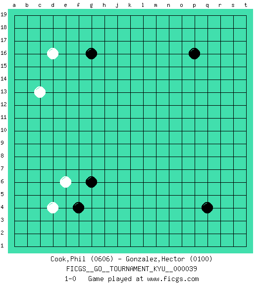 Last move : 1-0 2007 August 27 23:56:53 [Event "FICGS__GO__TOURNAMENT_KYU__000039 "] [Site "FICGS"] [Date "2007.07.20"] [Round "1"] [Black "Cook,Phil "] [White "Gonzalez,Hector "] [Result "1-0"] [Rating 1 "0606"] [Rating 2 "0100"] 1.q4 d16 2.p16 d4 3.g16 c13 4.f4 e6 5.g6 1-0 This go game has been lost on time (started : 2007.07.20 6:17:41) Here are the names of the openings (joseki) played in the four corners : Corner d16 : d16 g16Hoshi (Hwajeom, Seongjeom, Xingwei`) 4-4 Point. The star or hoshi (4-4) point, emphasizing influence at the potential expense of territory.Nikken Takagakari (Dukan Nop'dakeolch'im, E`r Gaojia, 2-Space High Approach). Black 2 is a light approach move. Rarely played in even games, Black 2 is typically employed in handicap games. White continues with 6-4 or 3-10. In Korean Sunjang Baduk White has a stone on 8-4. Corner d4 : d4 f4Hoshi (Hwajeom, Seongjeom, Xingwei`) 4-4 Point. The star or hoshi (4-4) point, emphasizing influence at the potential expense of territory.Ikken Takagakari (Hankan Nop'dakeolch'im, Yi Gaojia, 1-Space High Approach). White typically responds at 6-4 or 3-10. White 4-10 is played when White finds play on the right side advantageous. White 4-8 or 3-8 may be played when White has support at top. Player Black won this Go (weiqi, baduk) game.Follow this game move after move (download ) If you don't know ladders, don't play go. (Anonymous) Luck has a peculiar habit of favoring those who don't depend on it. (Author unknown)