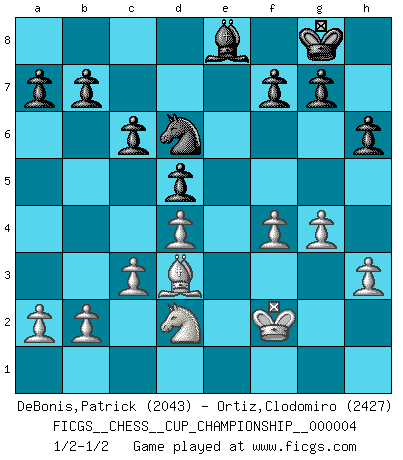 Last move : 1/2-1/2 2021 October 18 12:19:27 [Event "FICGS__CHESS__CUP_CHAMPIONSHIP__000004"] [Site "FICGS"] [Date "2021.09.20"] [Round "1"] [White "DeBonis,Patrick"] [Black "Ortiz,Clodomiro"] [Result "1/2-1/2"] [WhiteElo "2043"] [BlackElo "2427"] 1.e4 e5 2.Nf3 Nc6 3.Bb5 Nf6 4.O-O Nxe4 5.Re1 Nd6 6.Nxe5 Be7 7.Bf1 Nxe5 8.Rxe5 O-O 9.d4 Bf6 10.Re1 Re8 11.Bf4 Rxe1 12.Qxe1 Ne8 13.c3 d5 14.Nd2 Bf5 15.Qe3 c6 16.Re1 h6 17.h3 Bg5 18.Bxg5 Qxg5 19.g4 Qxe3 20.Rxe3 Bd7 21.Bd3 Nd6 22.f4 Re8 23.Rxe8+ Bxe8 24.Kf2 1/2-1/2 Ruy Lopez : Berlin defense, Open variation Kingside Castling by player White (move 4) Kingside Castling by player Black (move 8) This chess game ended in a draw. Follow this game move after move (download)I don't believe in psychology. I believe in good moves. (Bobby Fischer) Wenn Schach ein enormer Dschungel ist, der seine Myriaden von Geheimnissen nicht preisgeben will, dann sind Computer die Kettensägen einer gewaltigen ökologisch unsensiblen Nutzholzfirma. (Nigel Short) Coloca el contenido de las piezas del Ajedrez en un sombrero, agitalo vigorosamente, arrojalas en un tablero desde una altura de 30 centimetros y así obtendras el estilo de Steinitz. (H. E. Bird) Donnez-moi un Cavalier en 6e et je gagnerais toutes mes parties. (Steinitz) A generalist learns less and less about more and more until he knows nothing about everything. (Author unknown)