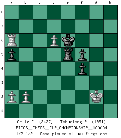 Last move : 1/2-1/2 2021 October 29 1:57:25 [Event "FICGS__CHESS__CUP_CHAMPIONSHIP__000004"] [Site "FICGS"] [Date "2021.09.20"] [Round "1"] [White "Ortiz,Clodomiro"] [Black "Tabudlong,Ronnie"] [Result "1/2-1/2"] [WhiteElo "2427"] [BlackElo "1951"] 1.d4 d5 2.c4 e6 3.e3 Nf6 4.cxd5 exd5 5.Bd3 Bd6 6.Nc3 O-O 7.Nb5 Be7 8.Ne2 a6 9.Nbc3 Re8 10.O-O Nbd7 11.f3 Bd6 12.Qb3 Nf8 13.e4 dxe4 14.fxe4 c5 15.e5 cxd4 16.exd6 dxc3 17.Bf4 Ng6 18.Bxg6 hxg6 19.Nxc3 Qa5 20.Kh1 Qc5 21.Rac1 Bd7 22.Qxb7 Bc6 23.Qb3 Nh5 24.Ne2 Bxg2+ 25.Kxg2 Rxe2+ 26.Kf3 Qf5 27.Kxe2 Nxf4+ 28.Kd2 Rd8 29.Rc6 Qg5 30.Qf3 Nd5 31.Kc2 Ne3+ 32.Kb1 Nxf1 33.Qxf1 a5 34.Qd3 Qf5 35.Qxf5 gxf5 36.Ra6 f4 37.Kc2 f6 38.h4 Kf7 39.Kd3 g5 40.Ke4 Re8+ 41.Kf5 Re5+ 42.Kg4 gxh4 43.Kxh4 f5 44.Kh3 Ke6 45.Kg2 1/2-1/2 Queen's gambit declined Kingside Castling by player Black (move 6) Kingside Castling by player White (move 10) 10 pieces endgame at move 43 : White KRPPP , Black KRPPP WHITE : King + 1 Rook 3 Pawns BLACK : King + 1 Rook 3 Pawns This chess game ended in a draw. Follow this game move after move (download)Up to this point White has been following well-known analysis. But now he makes a fatal error: he begins to use his own head. (Siegbert Tarrasch) Wenn Du nicht kämpfst, um anderen etwas zu beweisen, sondern nur für Dich selbst, dann bist du fast unbesiegbar. (Garry Kasparov) Para mi, el Ajedrez es la vida y cada partida es como una nueva vida. Todo jugador de Ajedrez suele vivir muchas vidas durante su vida. (Eduard Gufeld) Les Echecs ont trois composantes : le temps, l'espace et le matériel en dernier. (Mikhail Tal) Luck never made a man wise. (Seneca, Letters to Lucilius)