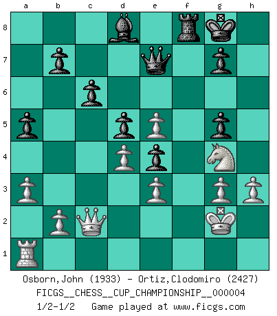 Last move : 1/2-1/2 2021 October 23 10:4:52 [Event "FICGS__CHESS__CUP_CHAMPIONSHIP__000004"] [Site "FICGS"] [Date "2021.09.20"] [Round "1"] [White "Osborn,John"] [Black "Ortiz,Clodomiro"] [Result "1/2-1/2"] [WhiteElo "1933"] [BlackElo "2427"] 1.e4 e5 2.Nf3 Nc6 3.Bc4 Bc5 4.c3 Nf6 5.d4 exd4 6.e5 d5 7.Bb5 Ne4 8.cxd4 Bb6 9.Nc3 O-O 10.Be3 Bg4 11.h3 Bh5 12.Qc2 Bg6 13.Qb3 Ne7 14.O-O c6 15.Bd3 Nf5 16.Qc2 Nxe3 17.fxe3 Ng5 18.Bxg6 hxg6 19.g3 Qe7 20.Ne2 Ne4 21.Kg2 Ba5 22.Nf4 g5 23.Nd3 Rae8 24.Nf2 f5 25.a3 Bd8 26.Nxe4 fxe4 27.Nh2 a5 28.Ng4 Rxf1 29.Rxf1 Rf8 30.Ra1 1/2-1/2 Giuoco Piano Kingside Castling by player Black (move 9) Kingside Castling by player White (move 14) This chess game ended in a draw. Follow this game move after move (download)It began to feel as though you were playing against Chess itself. - On playing against Robert Fischer. (Walter Shipman) Capablanka war das größte Genie der Schachgeschichte! Aber denken sie nicht er habe nichts vom Schach verstanden. Er wusste nur soviel wie er wissen musste um seine Ziele zu erreichen. (Mikhail Moiseyevich Botvinik) En el Ajedrez, cuando menos, el valiente hereda la tierra. (Edmar Mednis) Le système Elo représente seulement une moyenne. Il est simplement un indicateur de votre stabilité. (Anatoli Karpov) Perhaps the current trend of many chess professionals taking up the more lucrative pastime of poker is not a wholly negative one. It may not be too late for humans to relearn how to take risks in order to innovate and thereby maintain the advanced lifestyles we enjoy. And if it takes a poker-playing supercomputer to remind us that we can't enjoy the rewards without taking the risks, so be it. (The Chess Master and the Computer, by Garry Kasparov - 2010)
