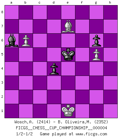 Last move : 1/2-1/2 2022 March 22 18:9:8 [Event "FICGS__CHESS__CUP_CHAMPIONSHIP__000004"] [Site "FICGS"] [Date "2021.09.20"] [Round "1"] [White "Wosch,Arkadiusz"] [Black "B. Oliveira,Marcio"] [Result "1/2-1/2"] [WhiteElo "2414"] [BlackElo "2352"] 1.e4 c5 2.Nf3 d6 3.d4 cxd4 4.Nxd4 Nf6 5.Nc3 a6 6.Be3 e5 7.Nb3 Be6 8.f3 Be7 9.Qd2 O-O 10.O-O-O Nbd7 11.g4 b5 12.g5 Nh5 13.Kb1 Nb6 14.Nd5 Nxd5 15.exd5 Bf5 16.Na5 f6 17.Nc6 Qc7 18.h4 Ng3 19.Rg1 Nxf1 20.Rgxf1 fxg5 21.hxg5 Bg6 22.Rf2 Rf5 23.b3 Bf8 24.f4 exf4 25.Bxf4 a5 26.Rdf1 a4 27.Qd4 Qd7 28.Kb2 a3+ 29.Kc1 Bf7 30.Nb4 g6 31.Bd2 Bg7 32.Qd3 Re8 33.Bf4 Qe7 34.Bd2 Rxf2 35.Rxf2 h5 36.Qf3 Rf8 37.Nc6 Qd7 38.Qd3 Qg4 39.Qe2 Re8 40.Qxg4 hxg4 41.c4 bxc4 42.bxc4 g3 43.Rg2 Re4 44.Rxg3 Rxc4+ 45.Kd1 Bb2 46.Rb3 Rc5 47.Rb8+ Kg7 48.Nb4 Bxd5 49.Nd3 Rc4 50.Nxb2 axb2 51.Rxb2 Kf7 52.a3 Ke6 53.Rb4 Bf3+ 54.Ke1 Rxb4 55.axb4 Ke5 56.b5 d5 57.b6 d4 58.Bb4 Bb7 59.Be7 Ba6 1/2-1/2 Sicilian : Najdorf, Byrne (English) attack Kingside Castling by player Black (move 9) Queenside Castling by player White (move 10) 10 pieces endgame at move 51 : White KRBPP , Black KRBPP WHITE : King + 1 Rook 1 Bishop 2 Pawns BLACK : King + 1 Rook 1 Bishop 2 Pawns 9 pieces endgame at move 54 : White KBPP , Black KRBPP WHITE : King + 1 Bishop 2 Pawns BLACK : King + 1 Rook 1 Bishop 2 Pawns 8 pieces endgame at move 55 : White KBPP , Black KBPP WHITE : King + 1 Bishop 2 Pawns BLACK : King + 1 Bishop 2 Pawns This chess game ended in a draw. Follow this game move after move (download)Could we look into the head of a Chess player, we should see there a whole world of feelings, images, ideas, emotion and passion. (Alfred Binet) Ein Isolani verdüstert die Stimmung auf dem ganzen Schachbrett. (Savielly Grigorievitsch Tartakower) El Ajedrez es 99 por ciento táctica. (Teichmann) Dans le domaine de la peinture, de la gravure et de la sculpture, dès la première décennie de notre siècle, les artistes abandonnent la représentation de la partie d'échecs pour se concentrer sur les pièces, sur les échiquiers et sur toutes les variations auxquelles les unes et les autres peuvent donner lieu. On passe en quelque sorte d'un thème social à un thème musical (au sens de la musica médiévale, c'est-à-dire d'une notion qui inclue le rythme, l'harmonie, la construction et la déconstruction, etc.). Graphiquement et picturalement, l'échiquier apparaît comme une structure ouverte, dynamique, d'une richesse infinie, autorisant toutes les combinatoires et débouchant sur des mouvements et des rythmes de nature exponentielle. (Michel Pastoureau) When it is a question of money, everybody is of the same religion. (Voltaire)